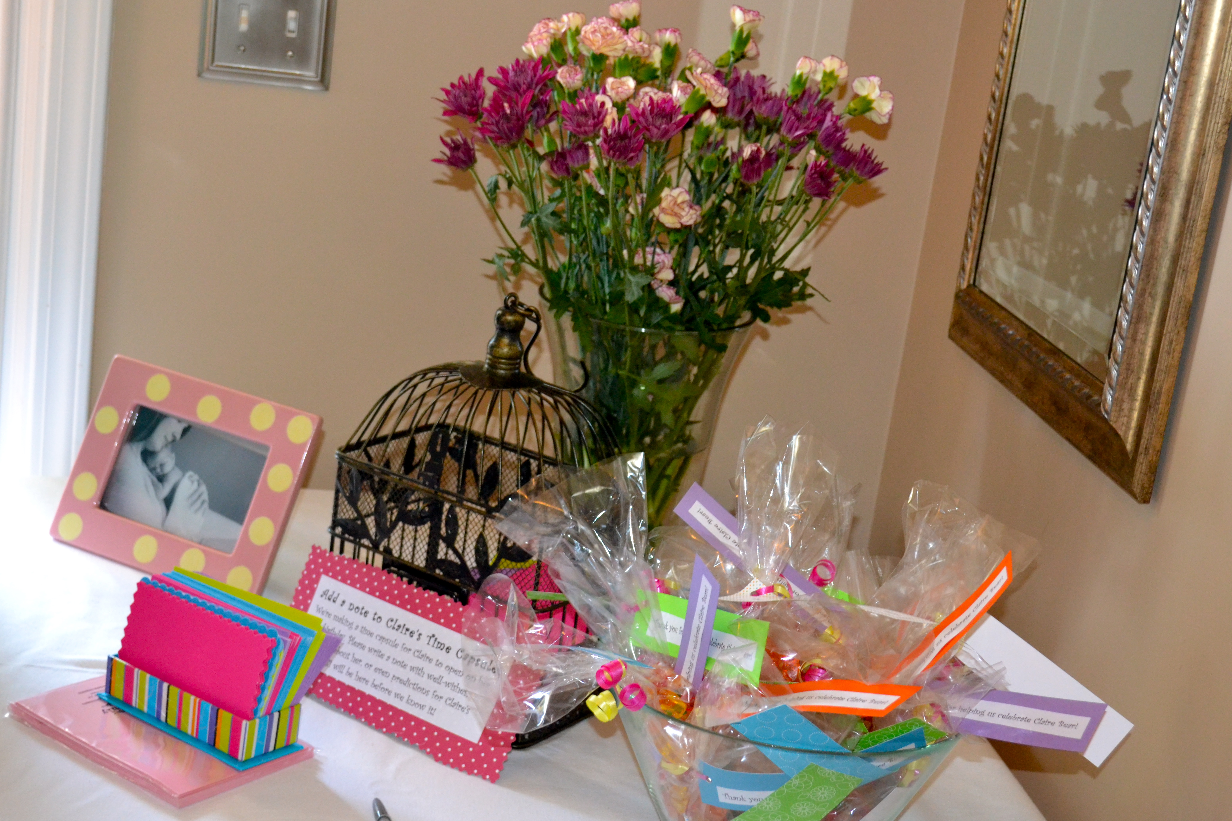 Daddy made two craft brews for the occasion — a “Ruby” Red (in honor of your hair) and a summery Peach Wheat. We collected letters for your time capsule (which you’ll receive on your 18th!), and we sent everyone home with a gummy bear treat bag — “Claire Bears.”