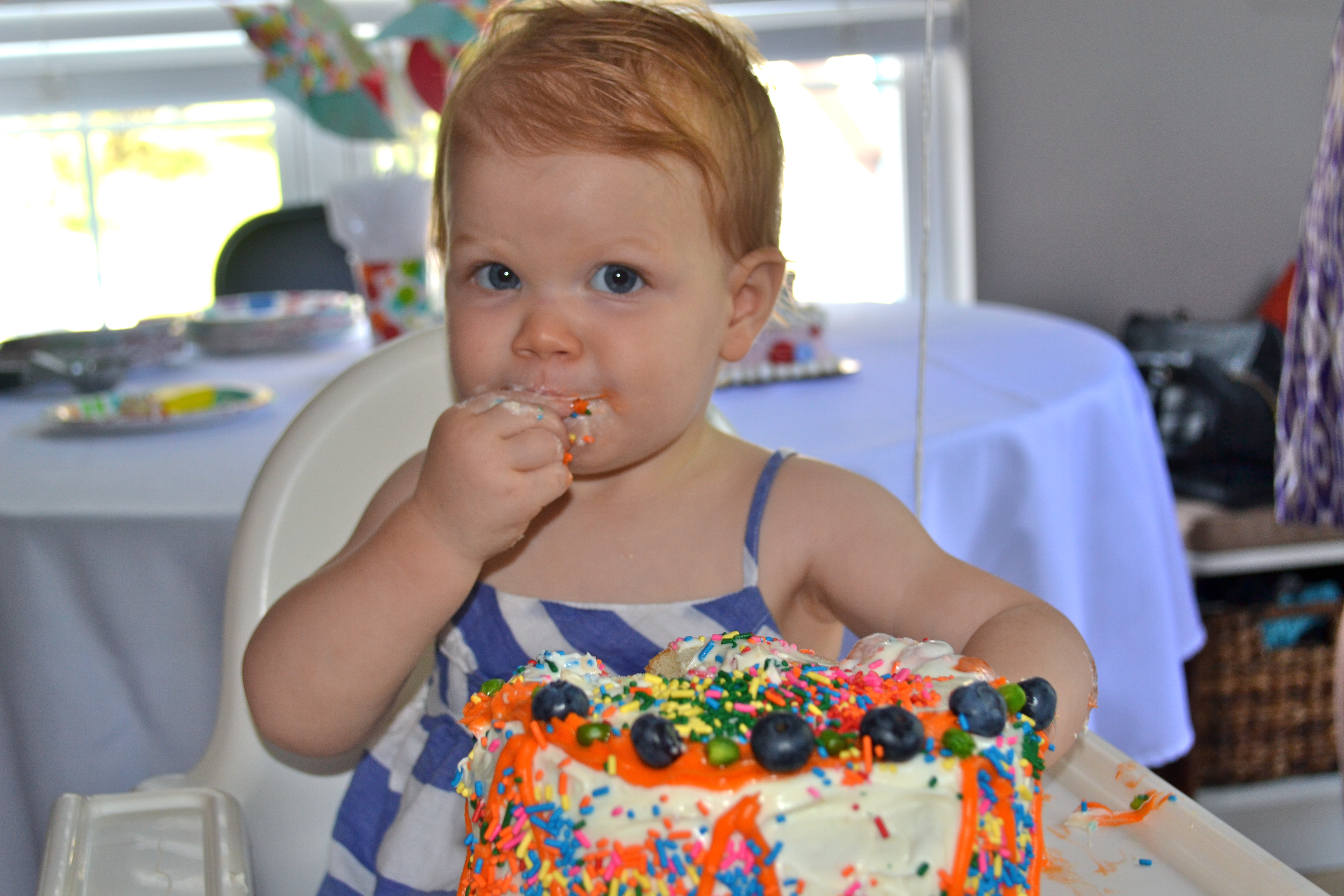 Nana Kay got a beautiful sheet cake for all the guests, but YOU got an extra special “Smash Cake” covered with your two favorite foods: blueberries and sweet peas. We thought for sure that you’d dive right into the cake — but instead you were fairly dainty…picking each berry and pea off before scooping up the icing.