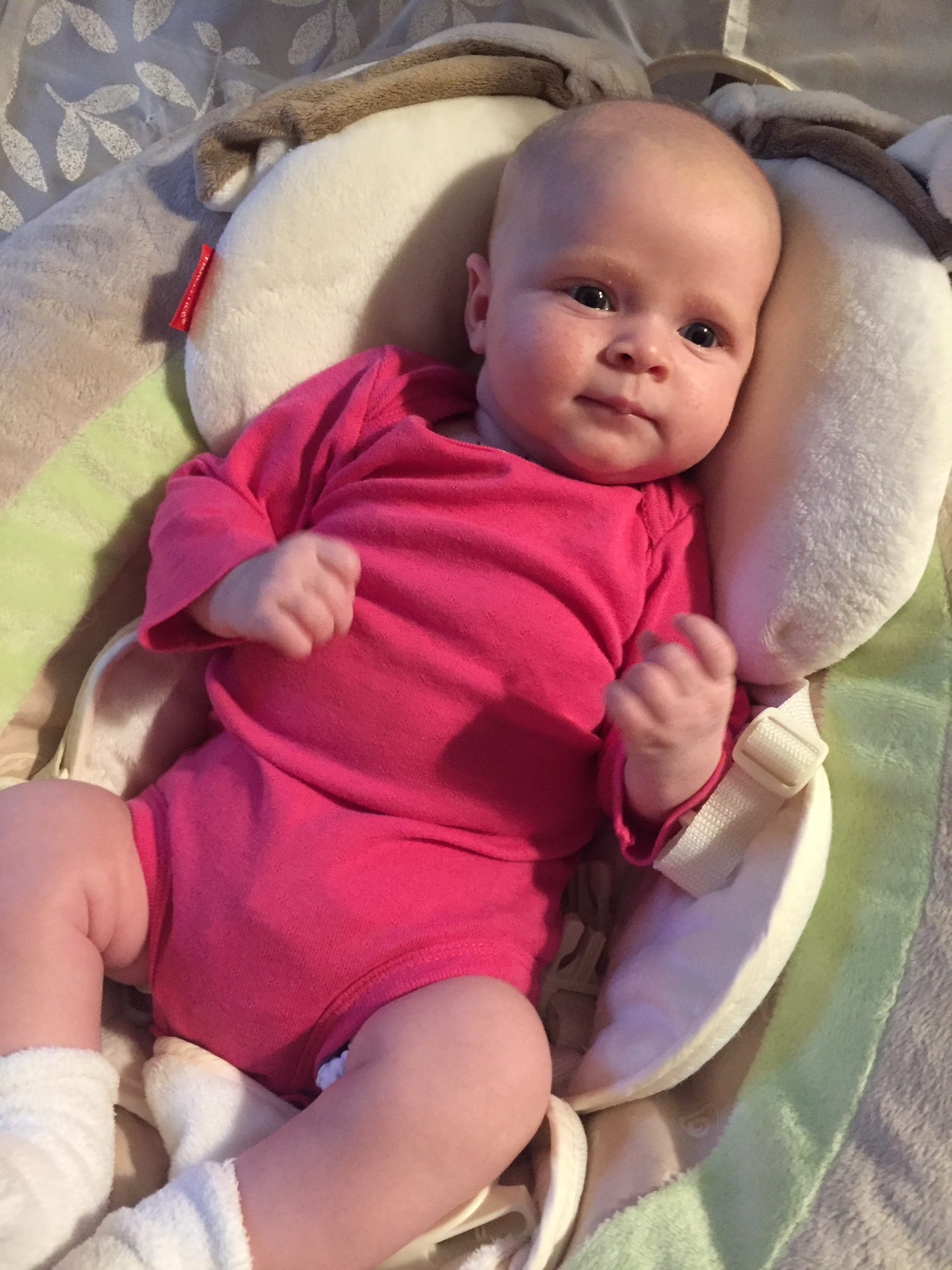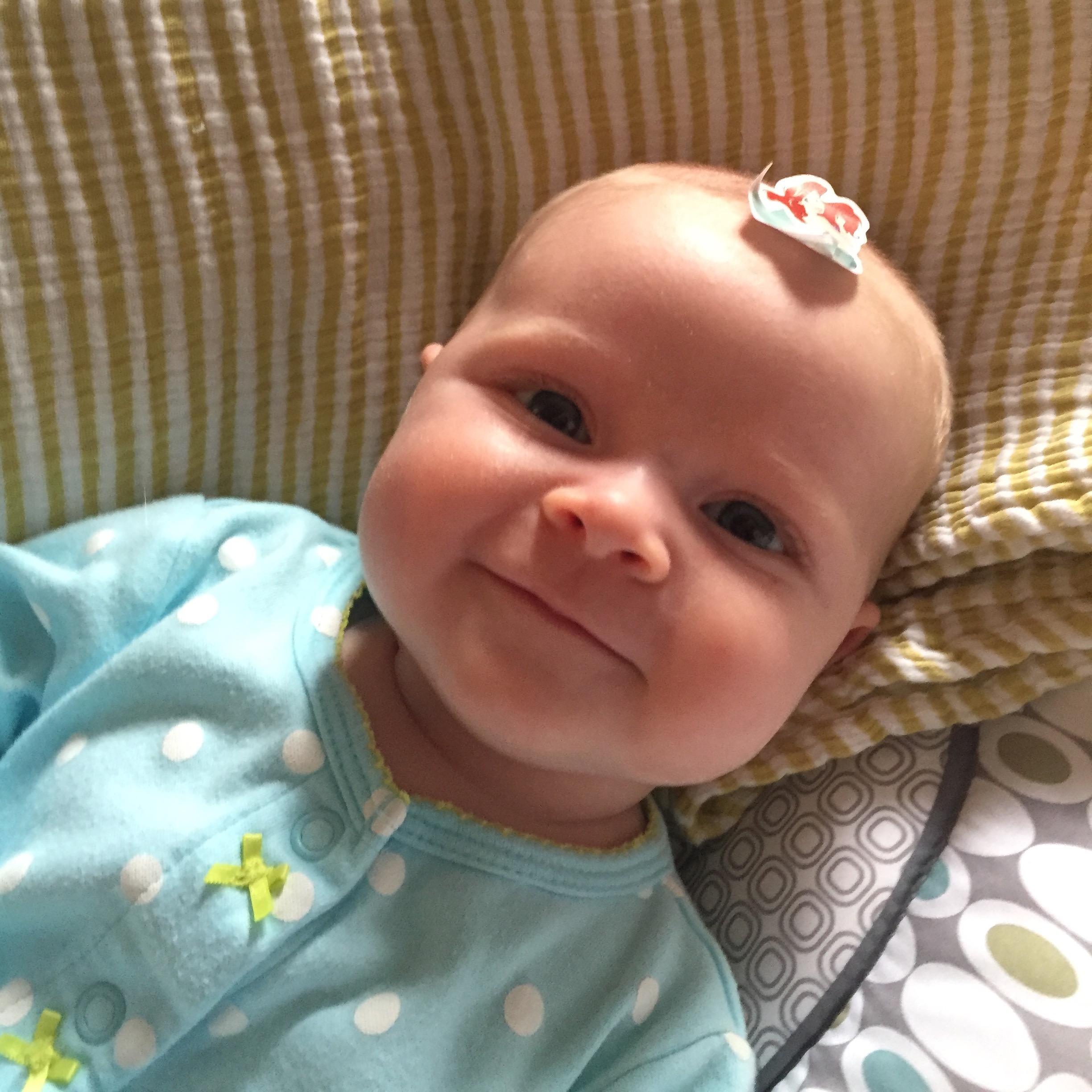 Whooo hoo, we’ve turned a corner. In the last week you’ve become a rock star sleeper. We begin your bedtime routine about 7:30 p.m. — jammies, swaddle, then prayers and a story with big sister. Afterwards, you nurse one last time in the dark, and then drift off around 8 p.m. From there, you’ve been sleeping til about 1:30 a.m. (awesome!), and then will sleep again until 5ish. We’re so proud!