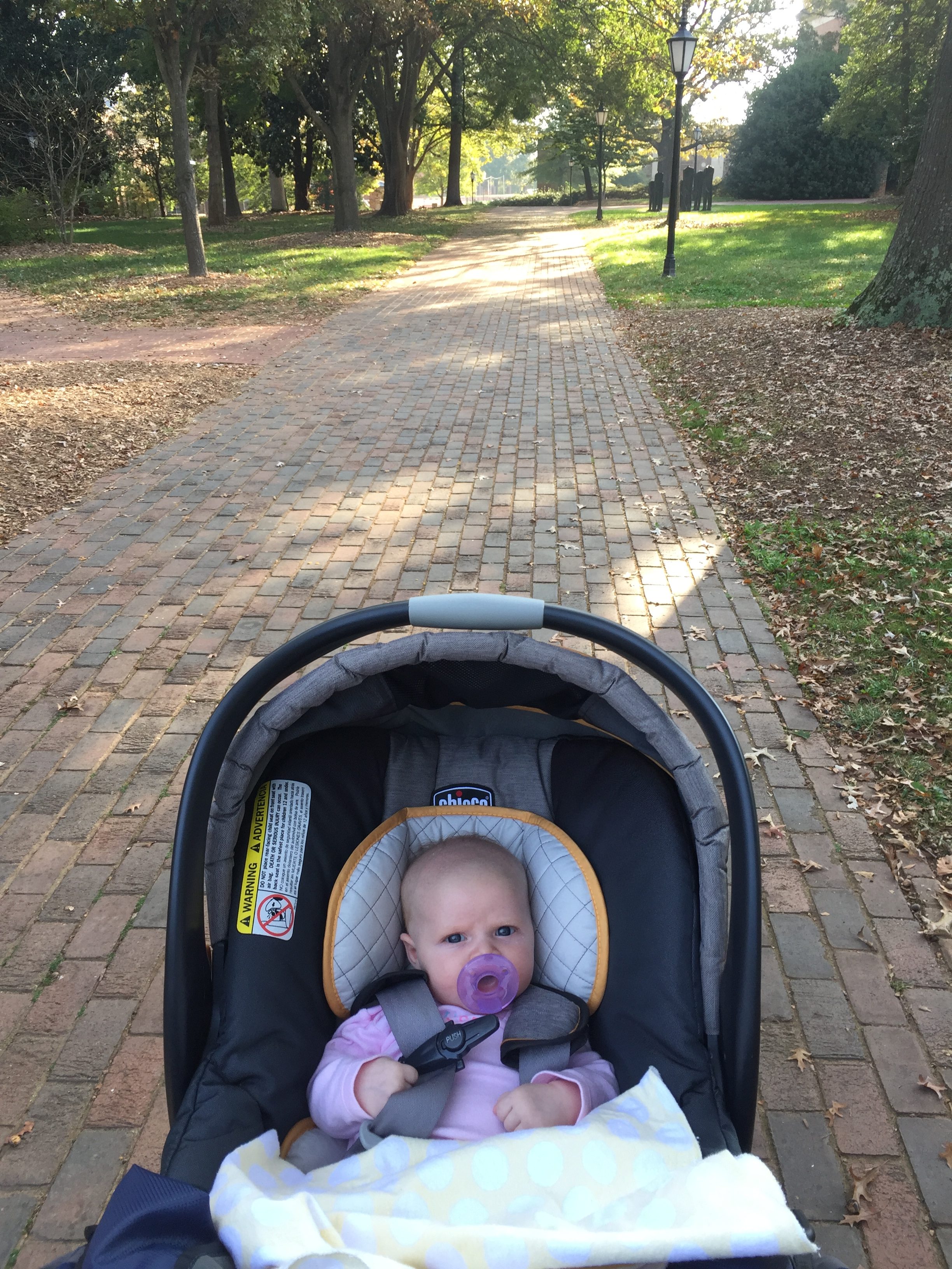 The biggest change this month was Daddy’s return to work. For your first six weeks, we enjoyed parental leave bliss — an unexpected addition to Daddy’s benefits that we found out about a week before you were born. Having him home was a dream (and so super helpful!), but starting November 1, Mommy began perfecting the solo two-kids juggle. Thankfully you’re a trouper in the Baby K’tan carrier, which makes Claire’s preschool drop-off/pick-up much simpler. Plus, sometimes you and Mommy will take advantage of the beautiful Davidson College campus and indulge in a fall walk.