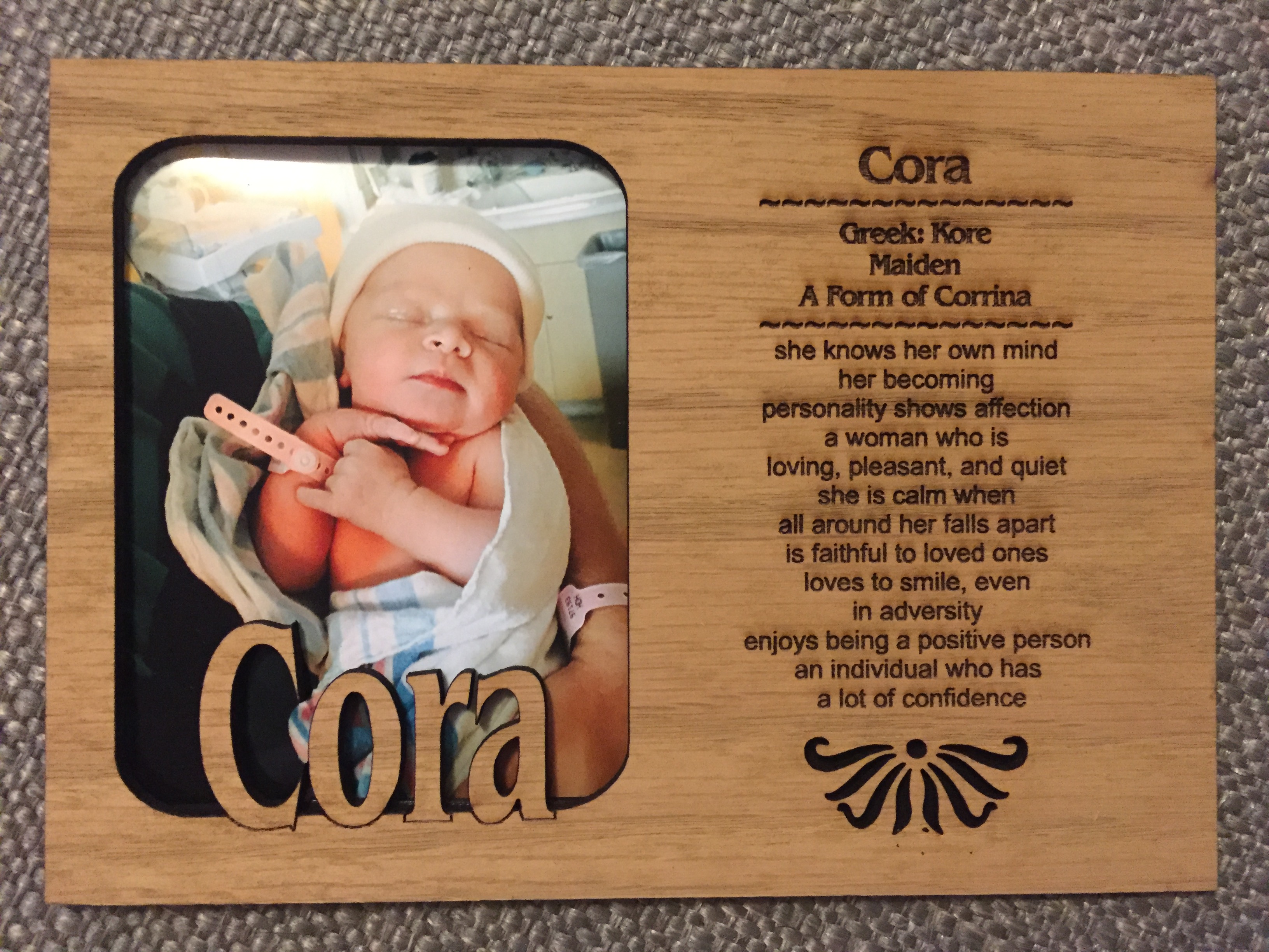 P.S. This was a gift from the wonderful realtor that helped us sell and buy our first and second homes. Look at the lovely description of your name!
