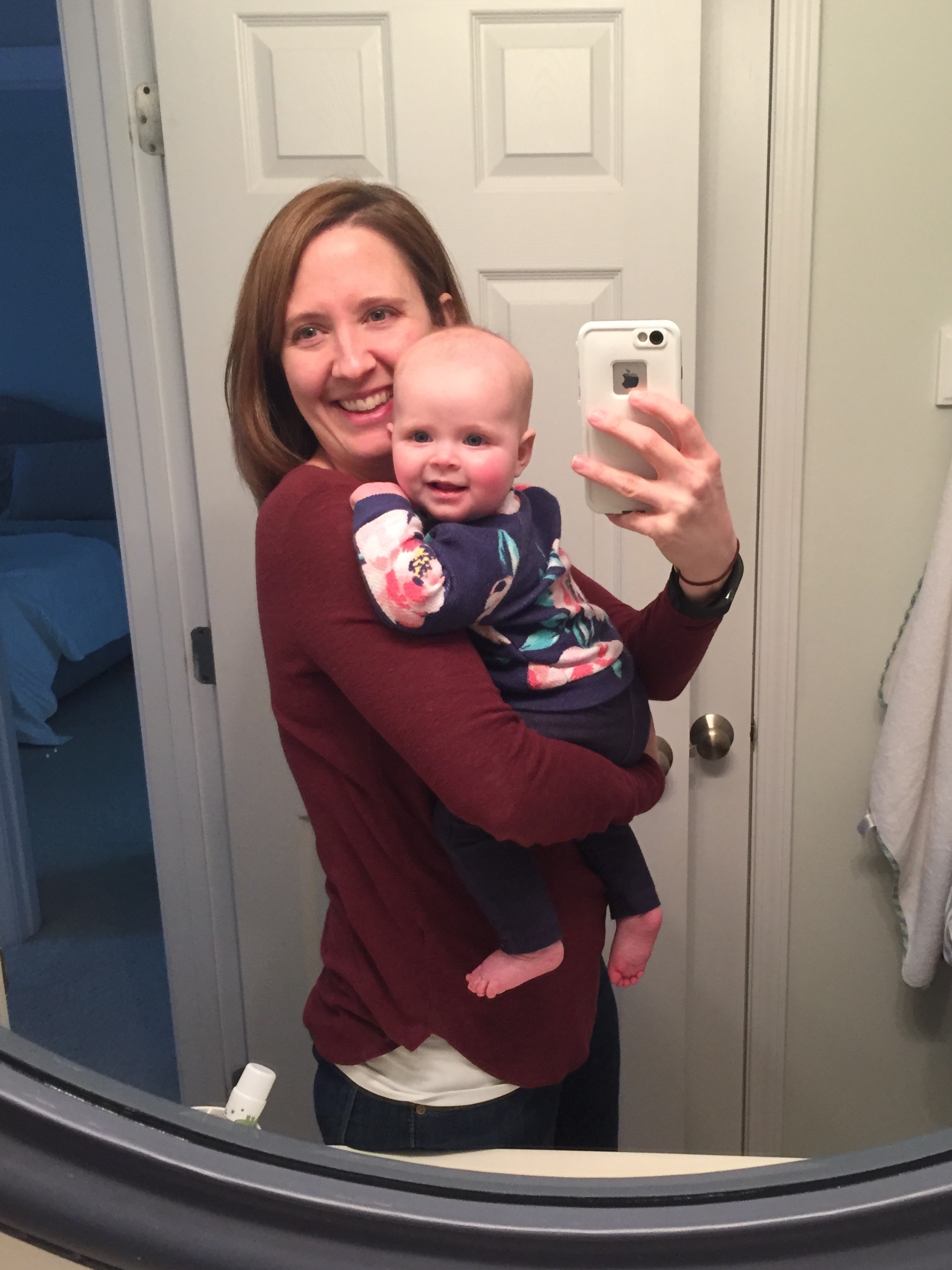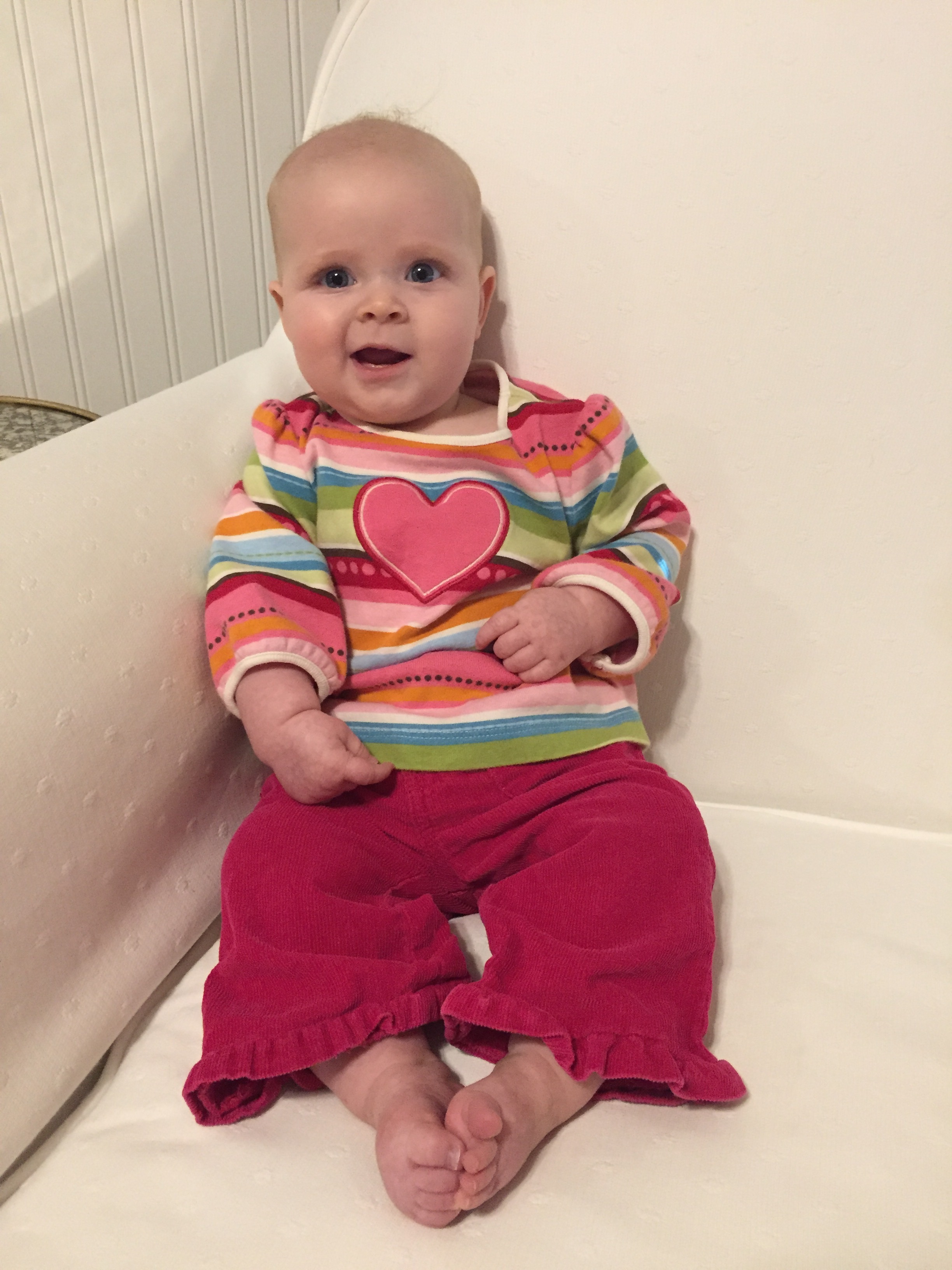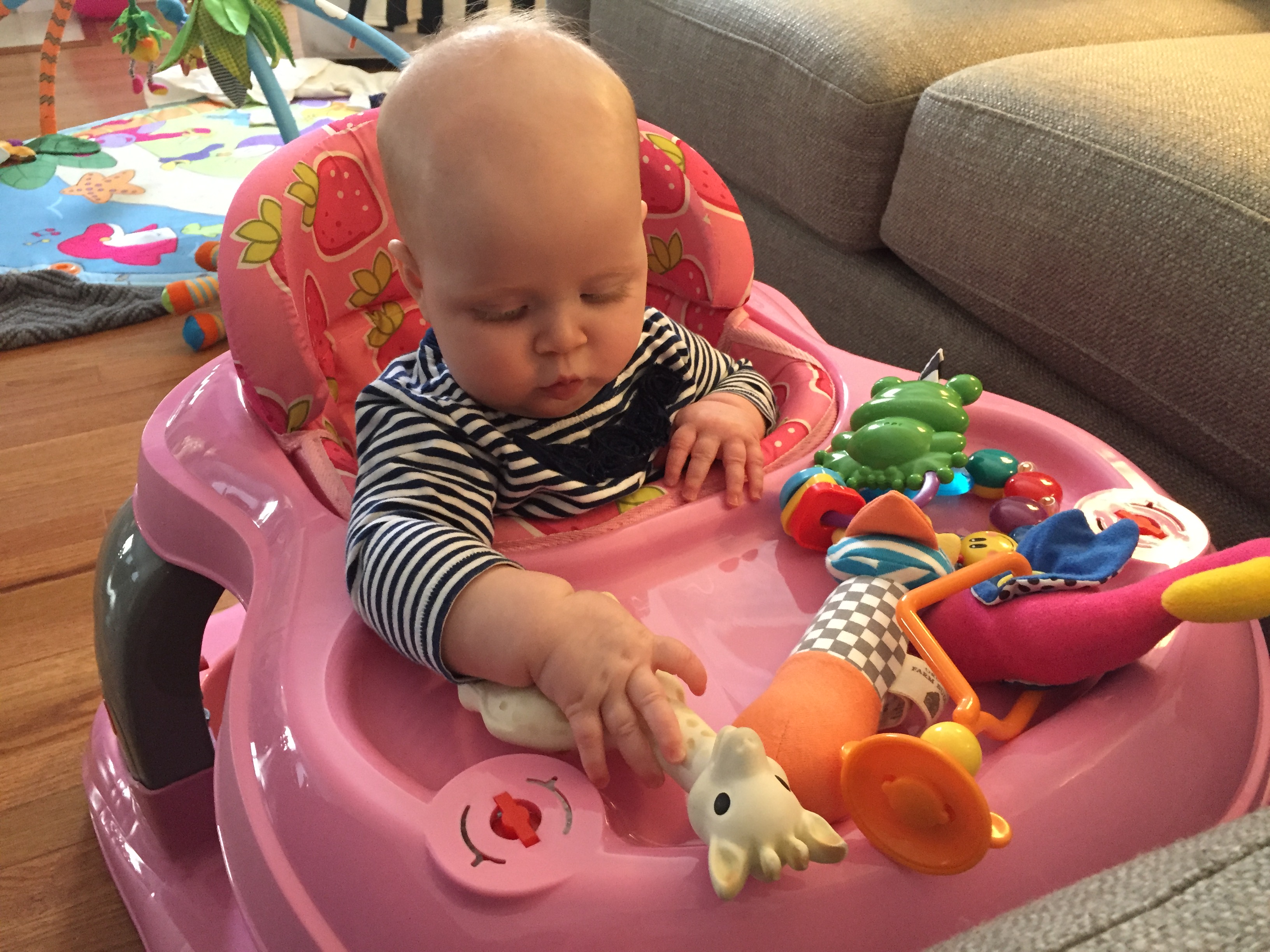 This has been a big month for you, sweet love. You still aren’t rolling, but you’re sure making the moves to (silly arm is still in the way!). In the meantime, though, you’re staying mighty busy in your new walker. Although your toes don’t yet touch the ground, we pile the toys high and you can tolerate about 20 minutes upright.