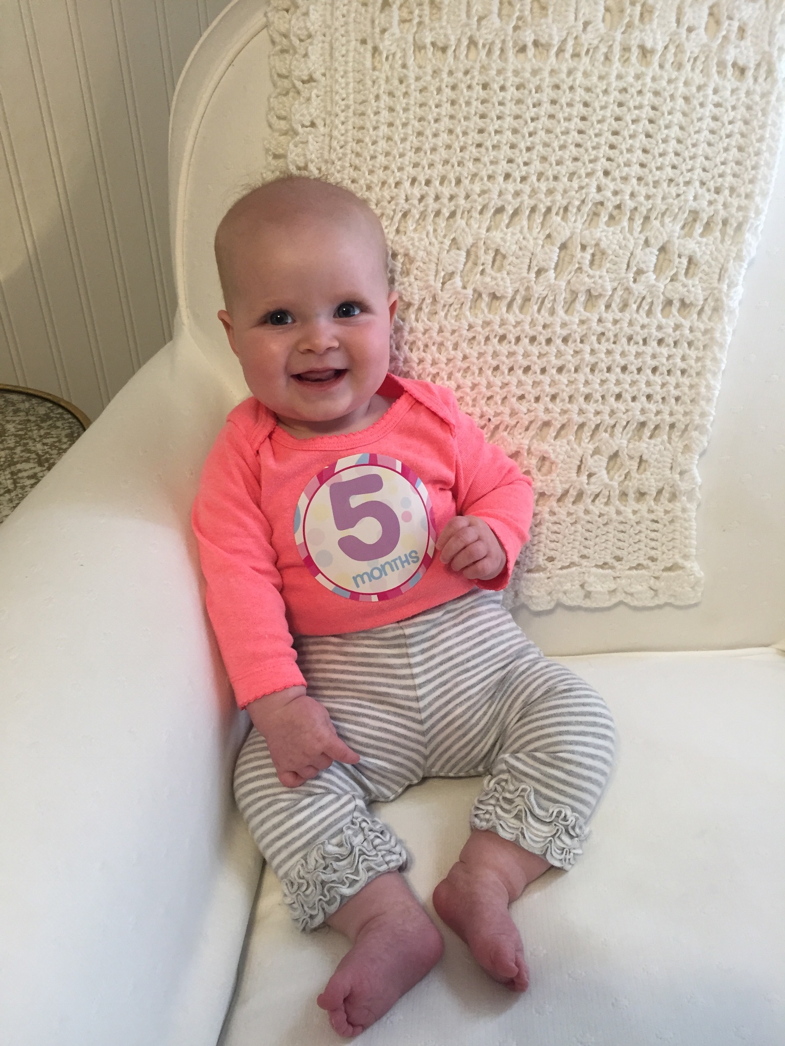 Five wonderful months have come and gone in a blink of an eye. Your days are filled with sweet smiles and Claire cuddles, and goodness it’s hard to remember what life was like before you arrived. You’re the smiliest baby we’ve ever known, and you love to flash your gummy grin at anyone that looks your way. What joy!