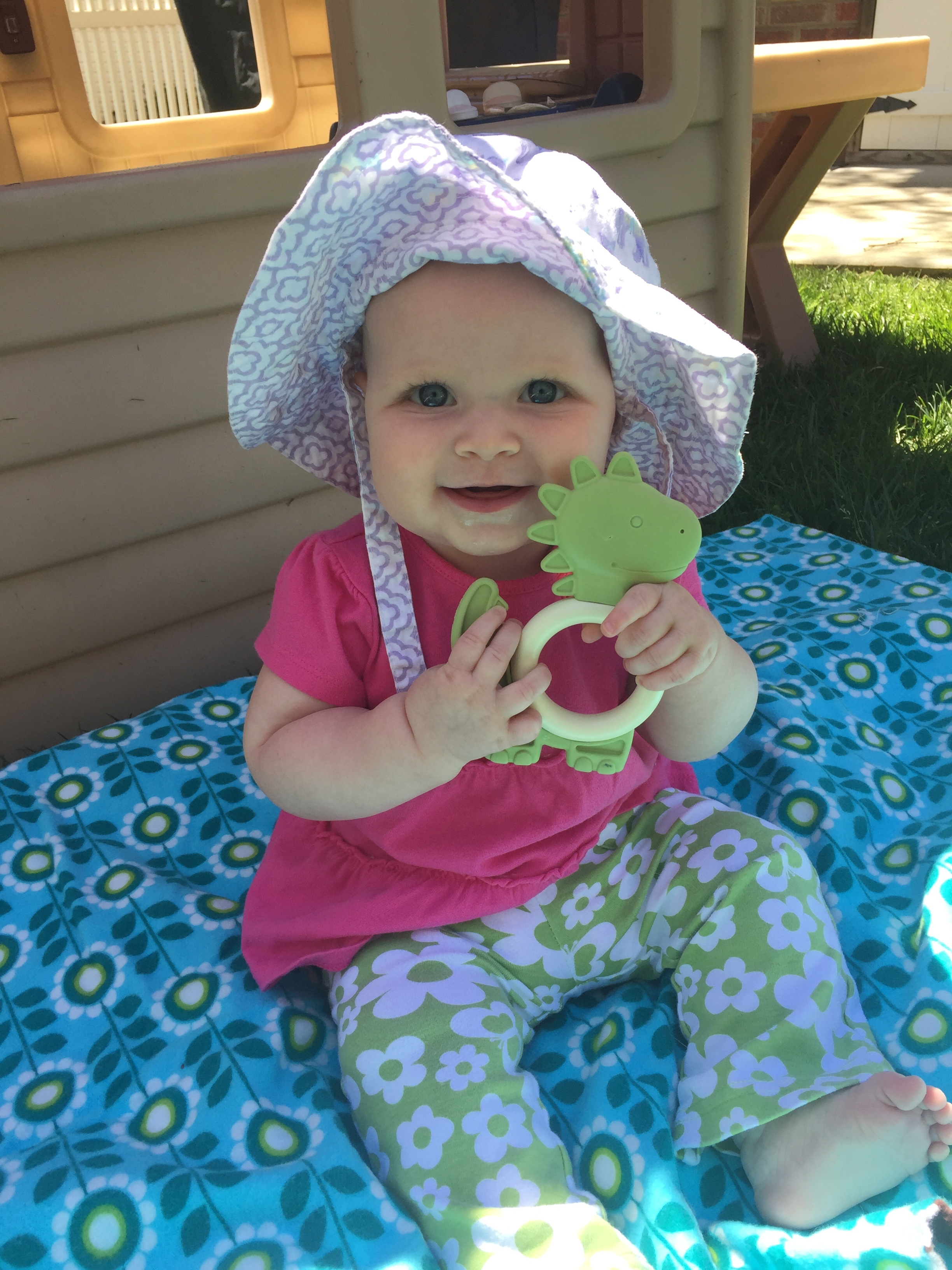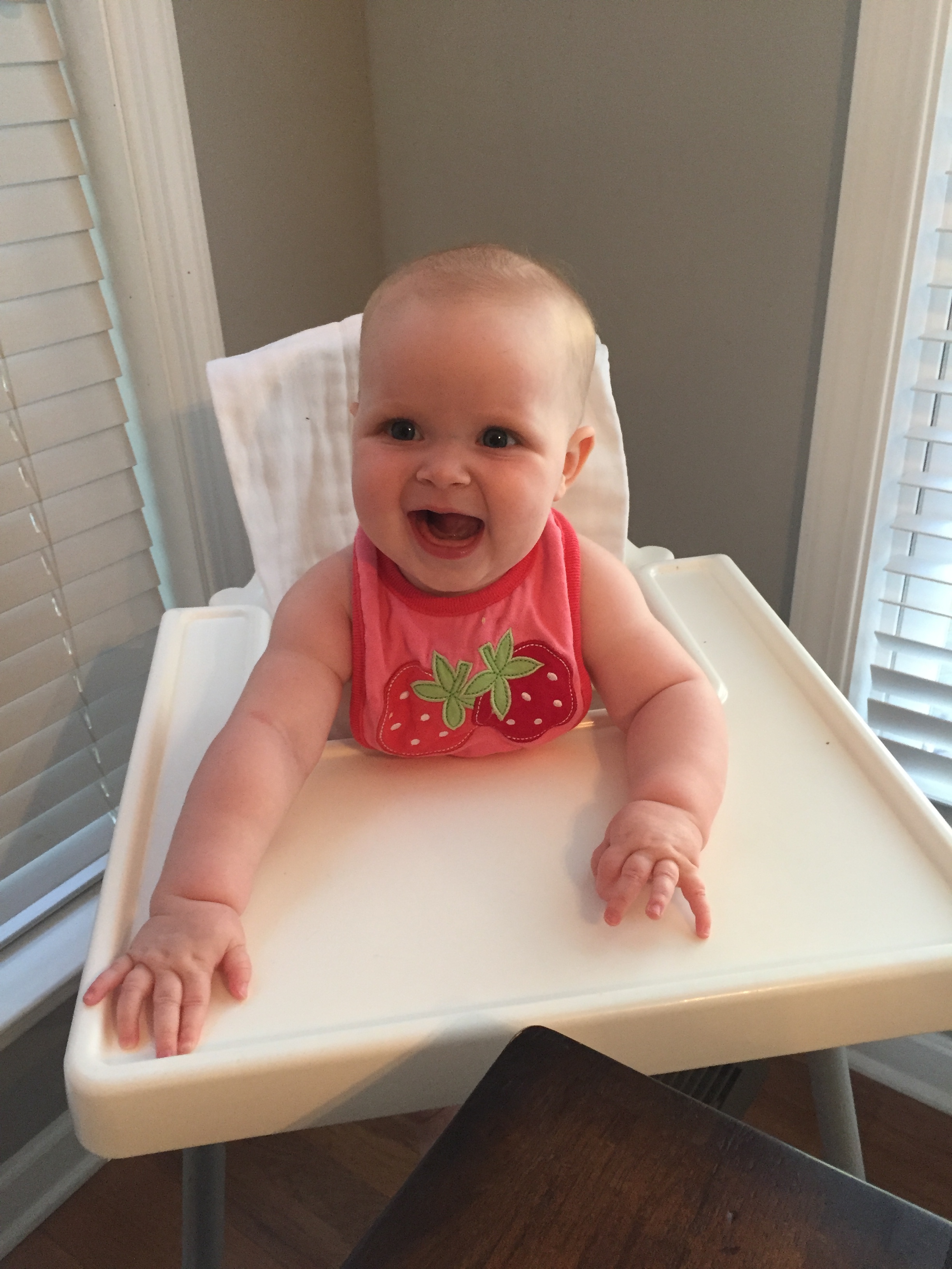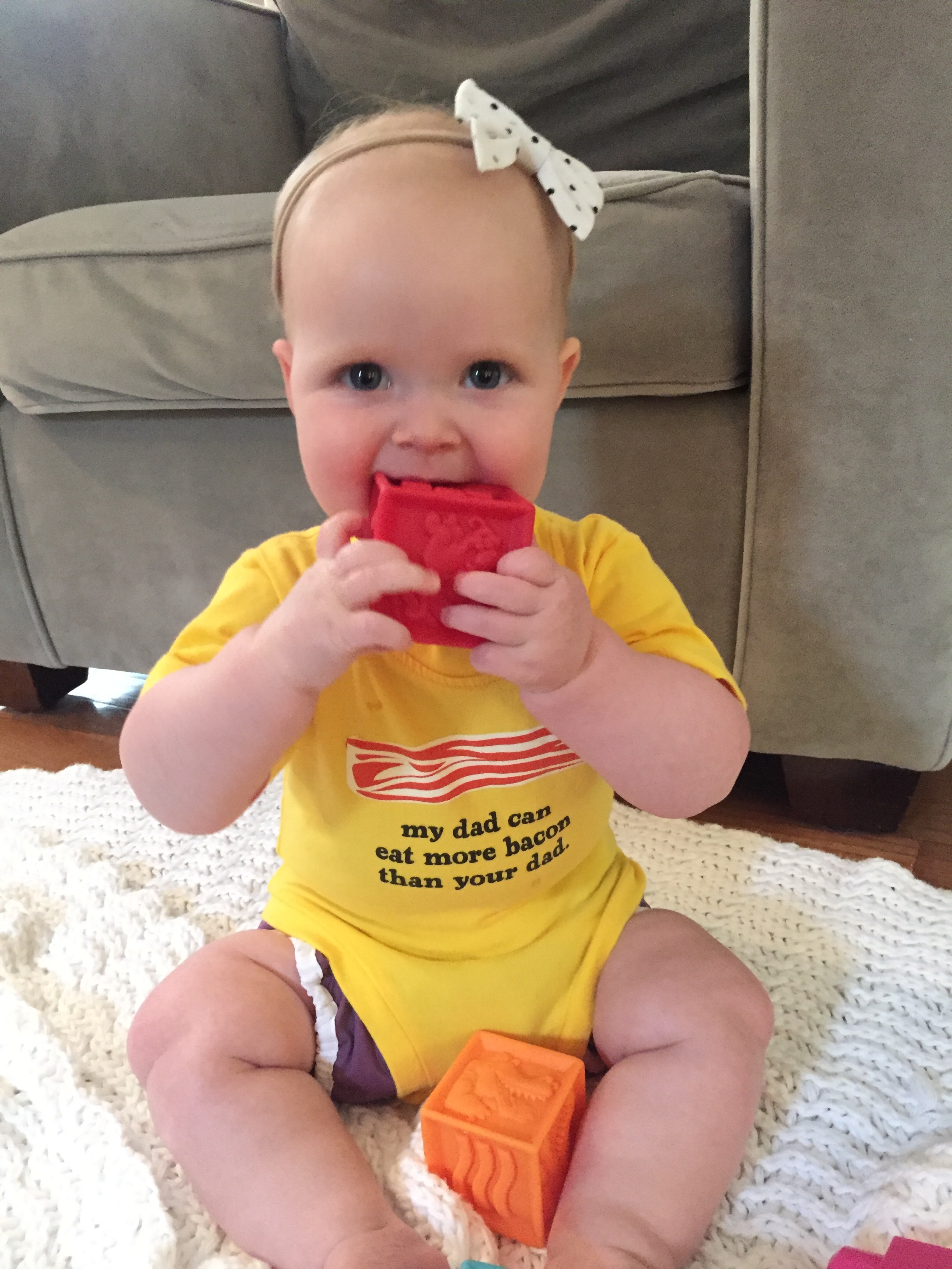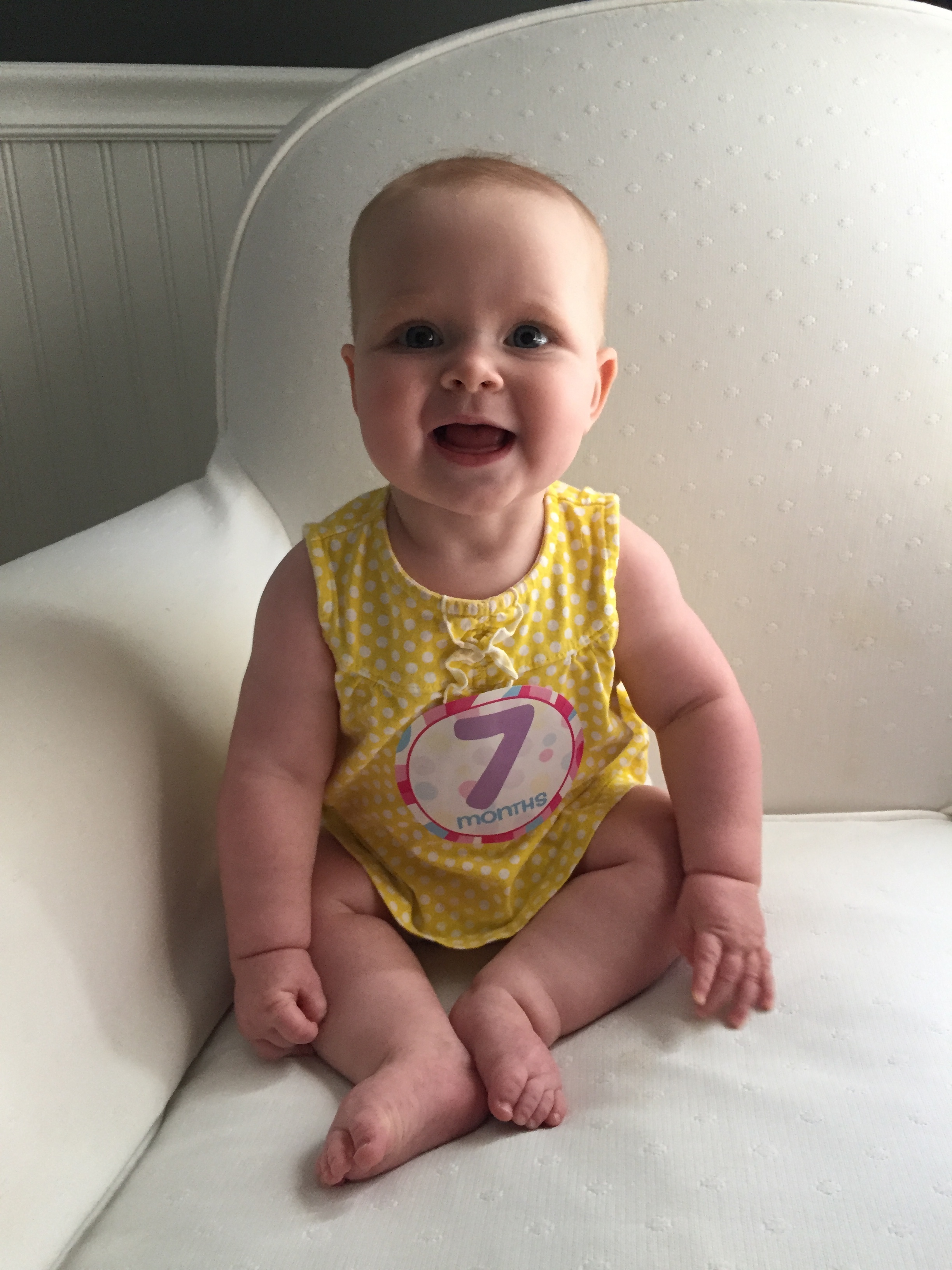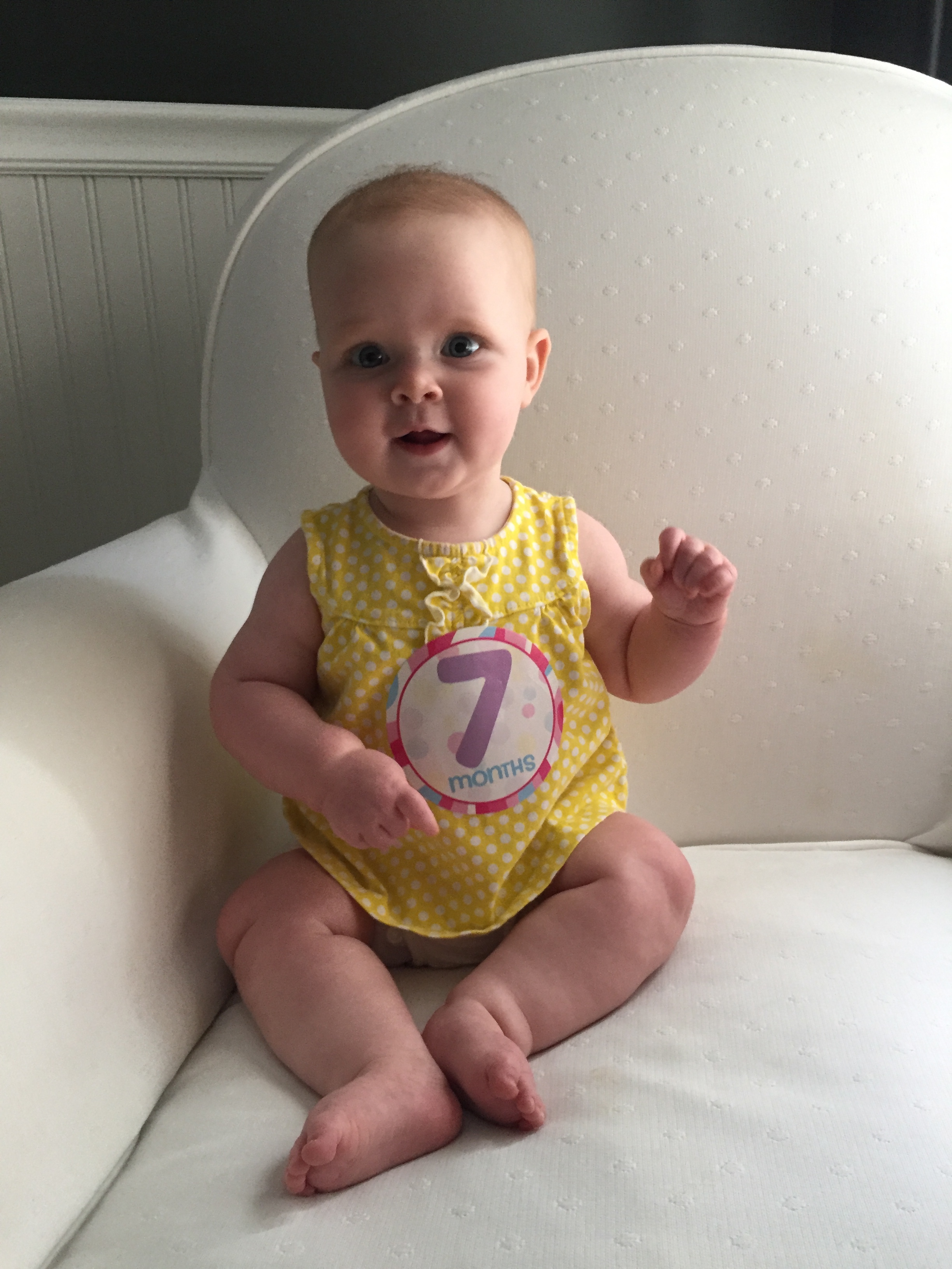The biggest change this month is that you’re now sitting unassisted. Yay, big girl! Once you learned to sit, you decided that was your preferred position…so we’re packing away the activity mat and letting you enjoy your new skill. We still surround you with pillows to help keep that sweet head from accidental boo-boos, but otherwise you’re free to play play play.
