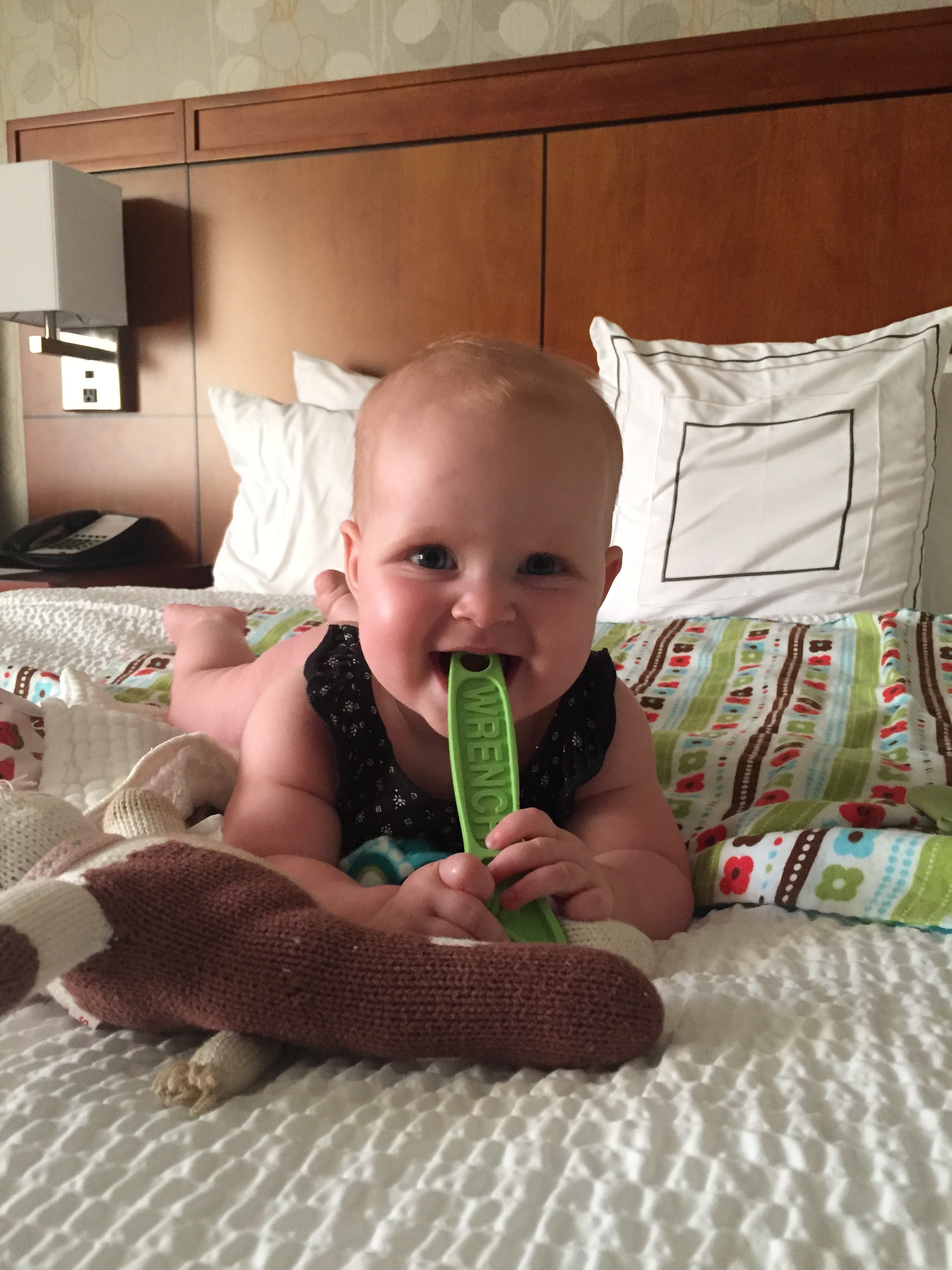 Oh sister, sister, you love nothing more than Claire Bear’s toys. Sometimes y’all share sweetly…other times the years seem to flash forward as we watch you pull hair and fuss over favorite dolls and books. You also love your feet, your toy tool set, a pretend remote, and anything else we’ll let you chew.