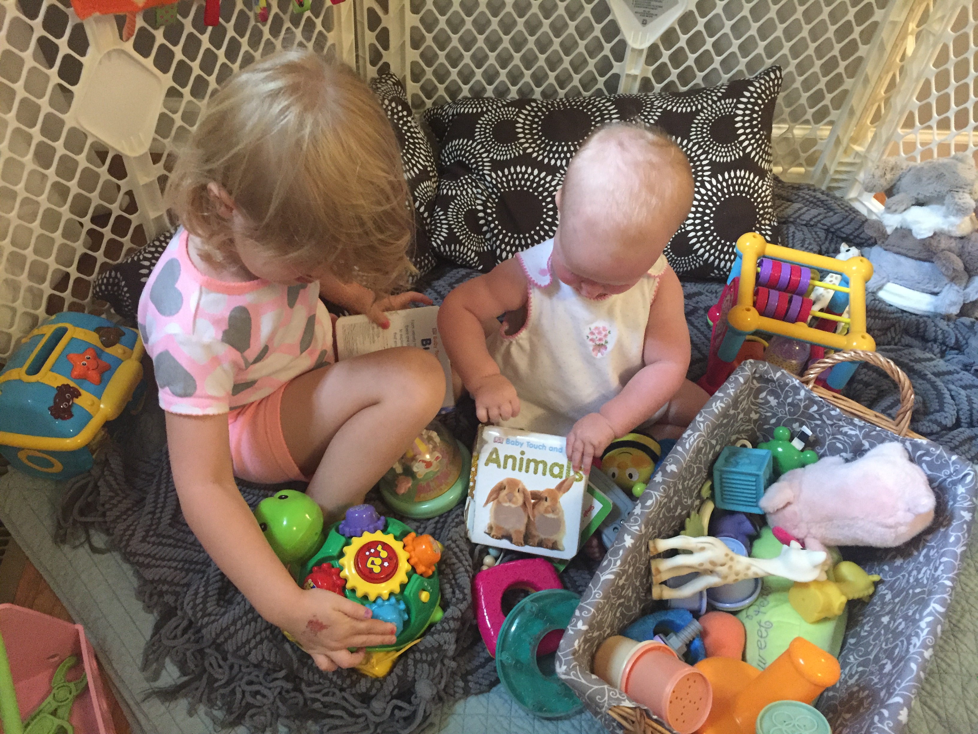 …loves to join you in your play yard — making it look like we’ve put you both in baby jail. You’ll happily play together for 20 minutes at a time, which is a delight to you both (and super helpful for Mommy and Daddy). Claire CANNOT WAIT for you to start crawling, and has promised to help us baby-proof soon.