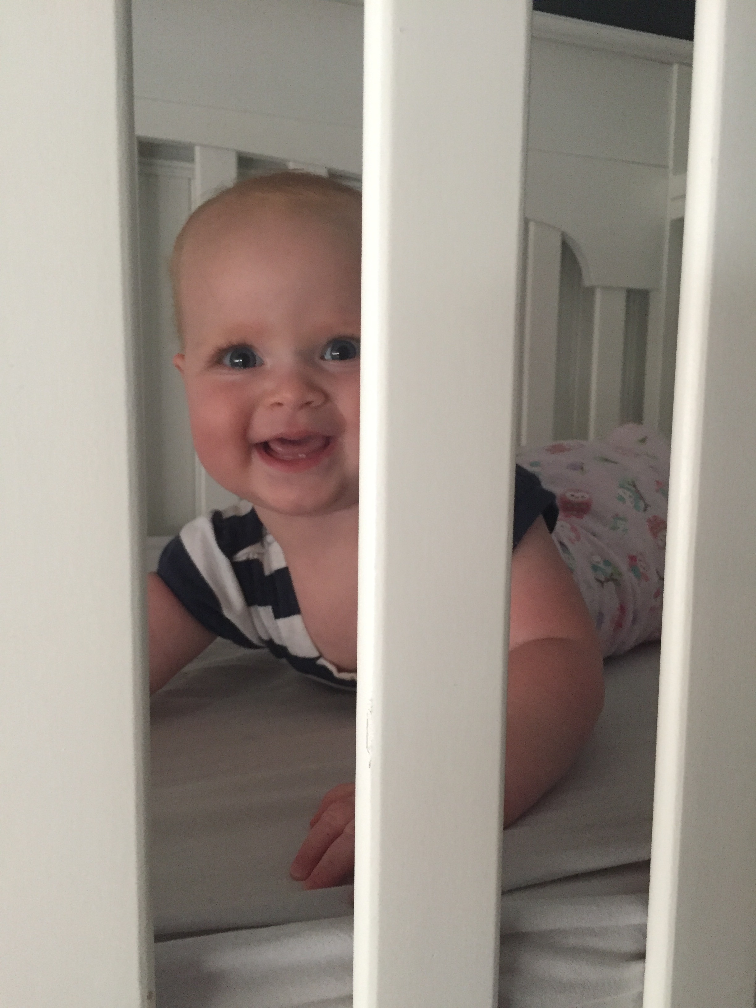 And my, how you’re changing. You now have three teeth (and two top ones on the way), have started pulling up a bit, babble constantly, clap with glee, and have been positioning yourself to crawl. You’re also full of personality, madly in love with Pinot kitty, and ever-curious about Big Sister’s antics.