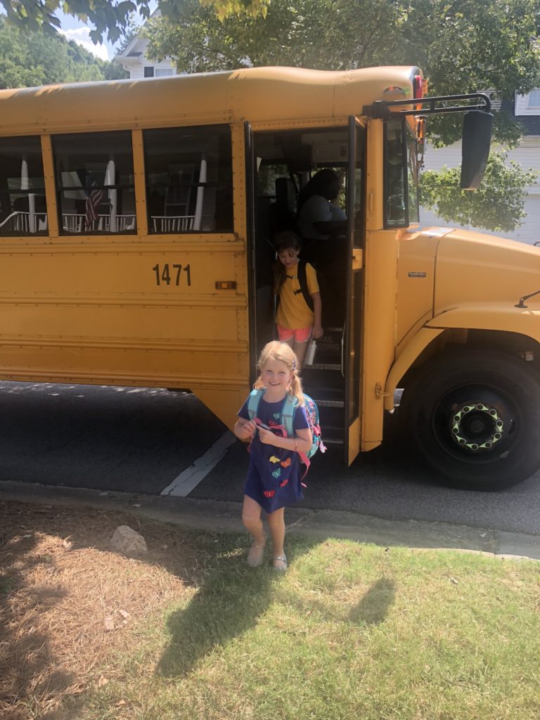 Our big girl hustled into her room with hardly a hesitation. (Kindergarteners have a staggered entry, so only 6 kids started with her on Tuesday. The full class convened on Friday.) Before we knew it, Adam, Cora, and I were back home and counting the hours til 3 p.m., when our brave Big Girl would ride the bus back (at her request).