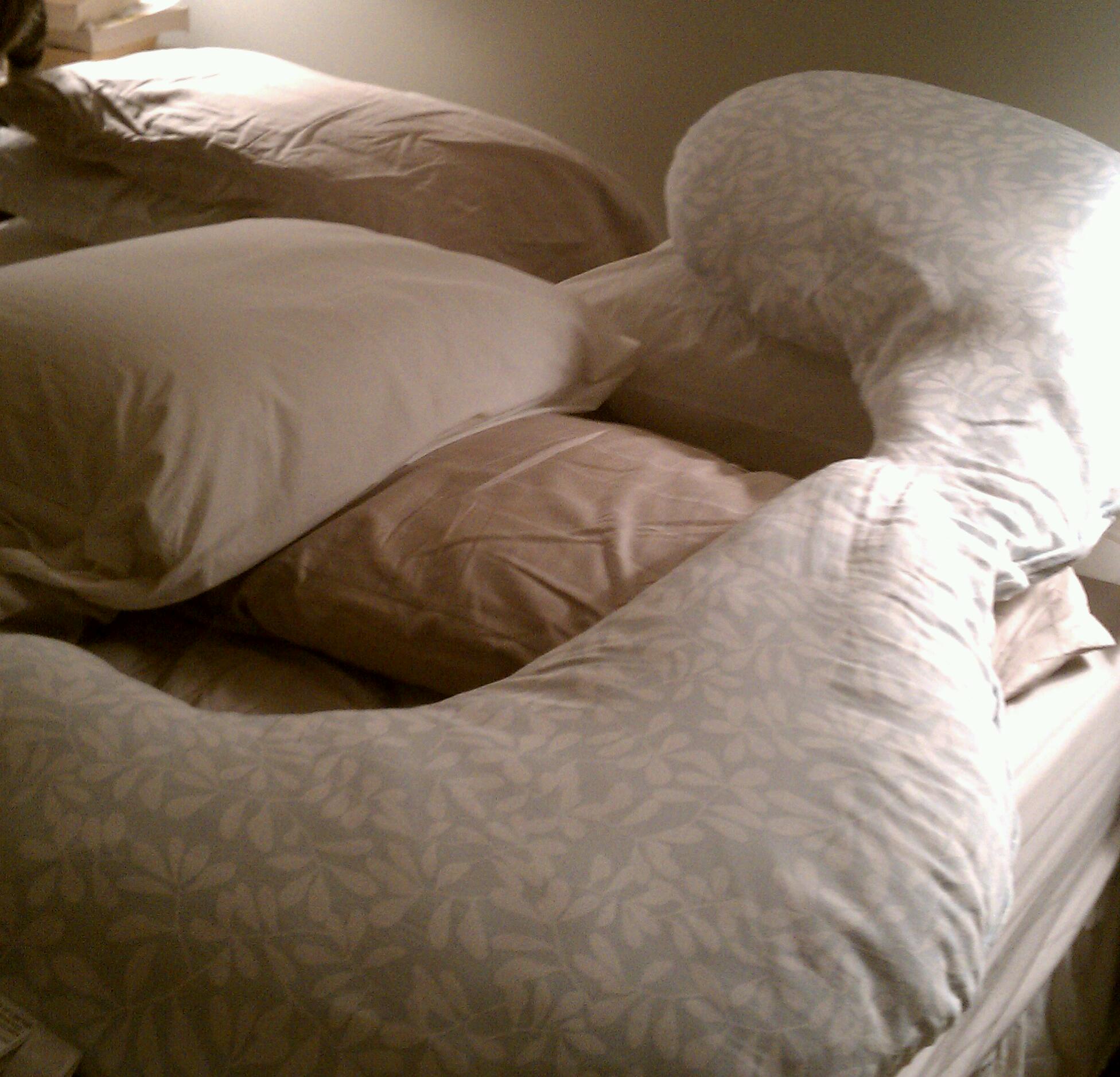 The white pillow in the middle goes against my back, keeping me from rolling over…the gray pillow in the center supports my lower back and belly…then the Boppy gets cuddled tight all night. It’s pretty laughable, I realize. But hey — I’ll do anything it takes to get as much sleep as possible before little tot arrives! (And, thankfully, sweet Adam hasn’t complained once.)
