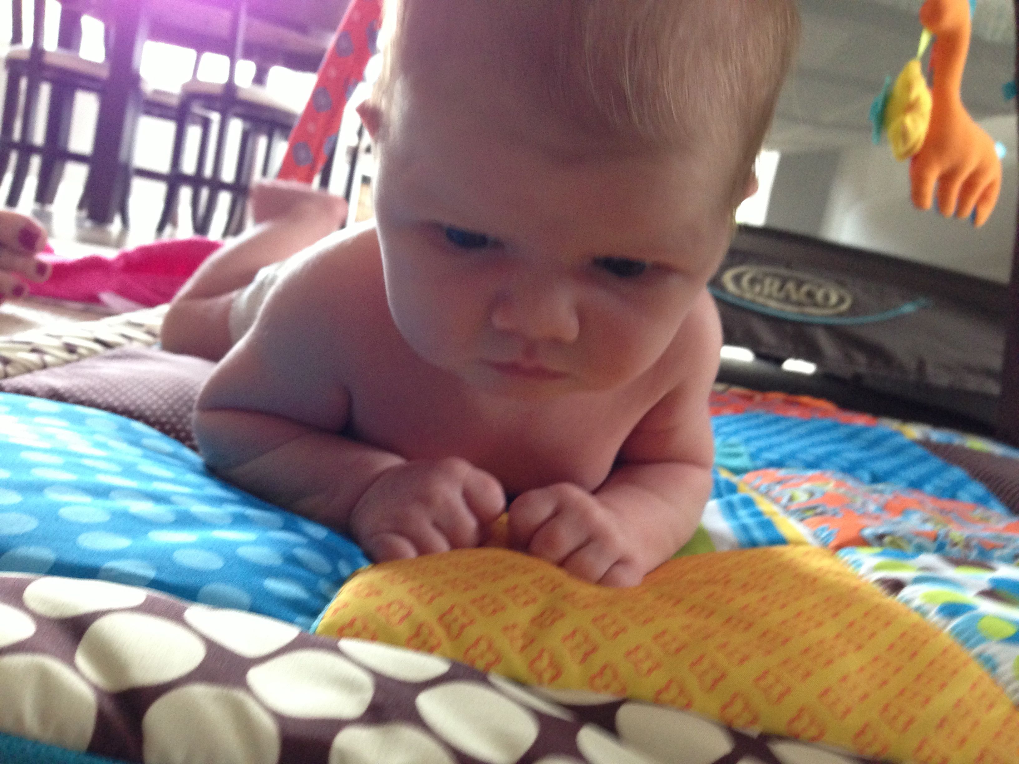 What’s keeping Mommy and Daddy busy: YOU! Babies are constant, and even though you sleep a good portion of the day, your naps are in hour or two-hour increments, meaning that the waking time between is spent nursing, burping, rocking, playing, and diapering. Oh, diapering. You’re averaging 12-14 diapers a day, little lady. That’s mighty impressive! So far we’ve been a fan of cloth, although we admit we’re cheating a bit by using a local diaper service. (Hey, our washing machine thanks us!) It feels good to know we’re helping the environment and keeping your booty a little healthier too. PLUS, diaper covers are adorable…and given how hot you tend to be, we often let you spend whole days hanging out in just your cute cloth.