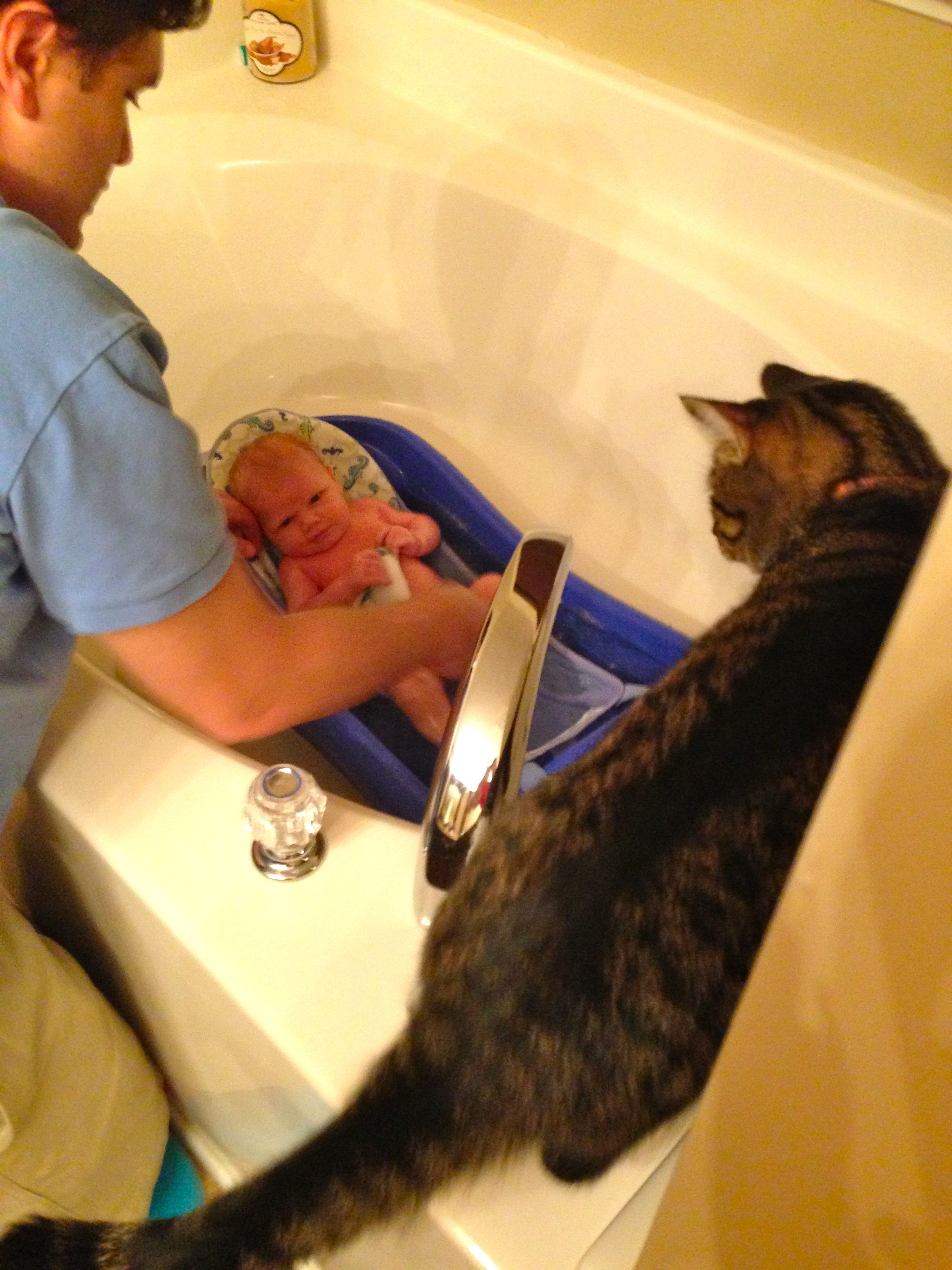 Sleeping: For your first few weeks we were certain you had your days and nights mixed up, baby. You’d sleep all day long, and then wake every hour or so throughout the night. This was fine at first because you’re super super cute, but let’s just say Mommy and Daddy are thrilled that your nighttime stretches are getting longer. We start our bedtime routine about 8:30 each evening, when we splash around in the bathtub (your furry brother likes to help), have a little “tender time” in your nursery with books and music, and enjoy a final feeding where (hopefully!) you’ll fall fast asleep nursing. At this point you’re sleeping swaddled in our room in the bassinet of your Pack-n-Play, but we’re getting eager to introduce you to your crib.