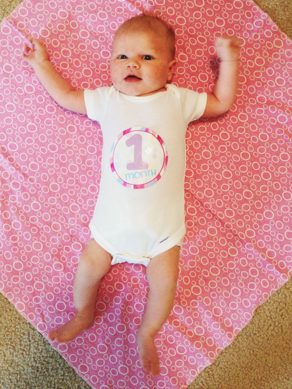 Play: Although “playtime” is fairly limited at one month of age, we spend time each day on your activity mat. Here, Mommy and Daddy help you do bicycle legs, “so big” reaches, and knee-to-elbow touches. Besides helping get out the gas (it’s true!), we think you like the active movements. We also give you some “naked time” each day when you can kick, punch, and wiggle diaper-free. You’ve been a hot baby since birth, and we think you really enjoy this refreshing taste of freedom.
