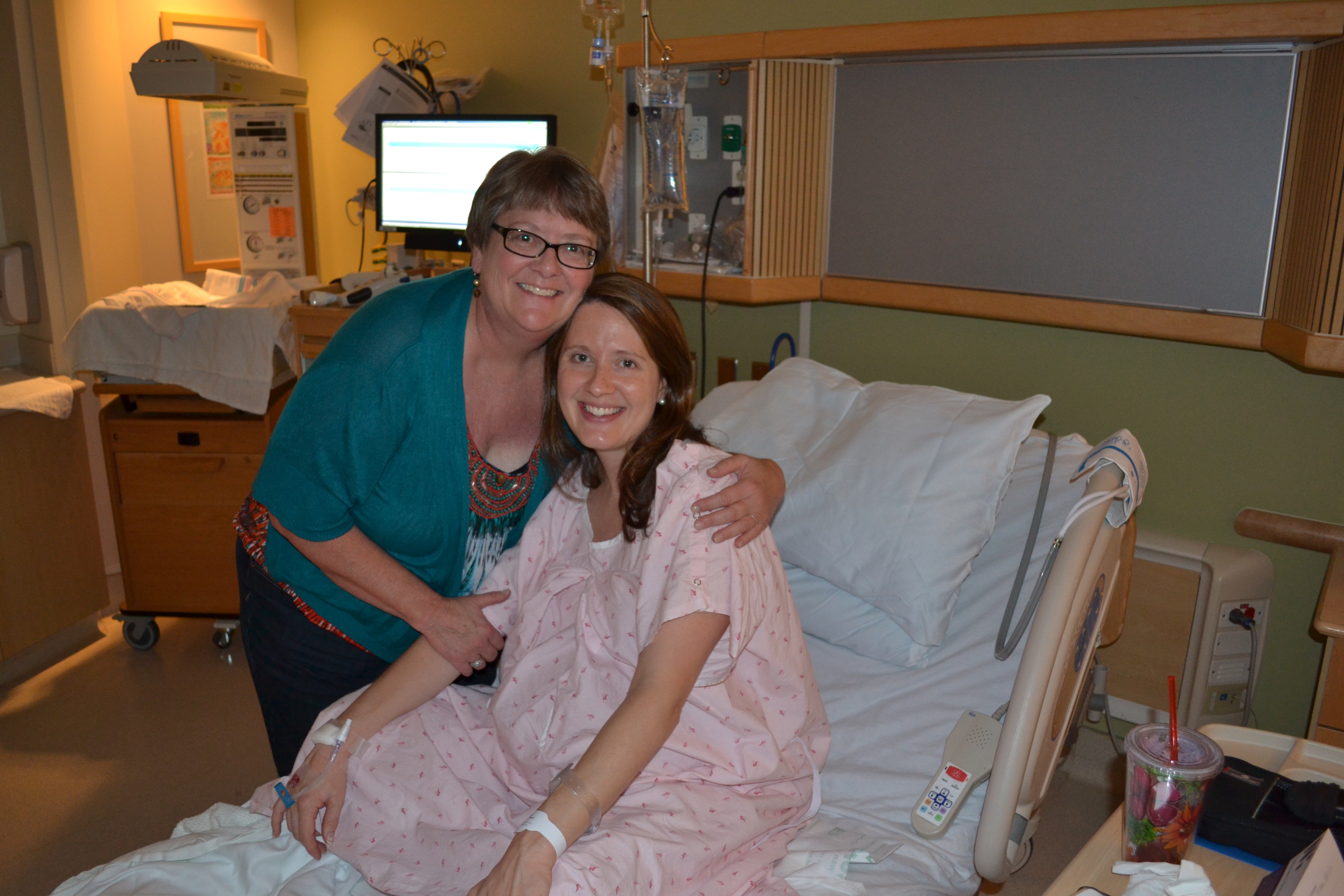 Soon, Mary Kay, Dad, Margie, and Mary Pat all arrived, and I had the chance to hug, kiss, and visit with them, too. At 12:30 p.m. I was still only measuring 7 cm, and my OB realized that although my water technically broke, the baby’s head was so low that only a small amount had drained. That explained the less-movie-like wake-up…and the slow down in my dilation progression. The fix? A long tool and a quick (painless) pop. What wasn’t painless? The crazy intense contractions that began coming in waves moments later.
