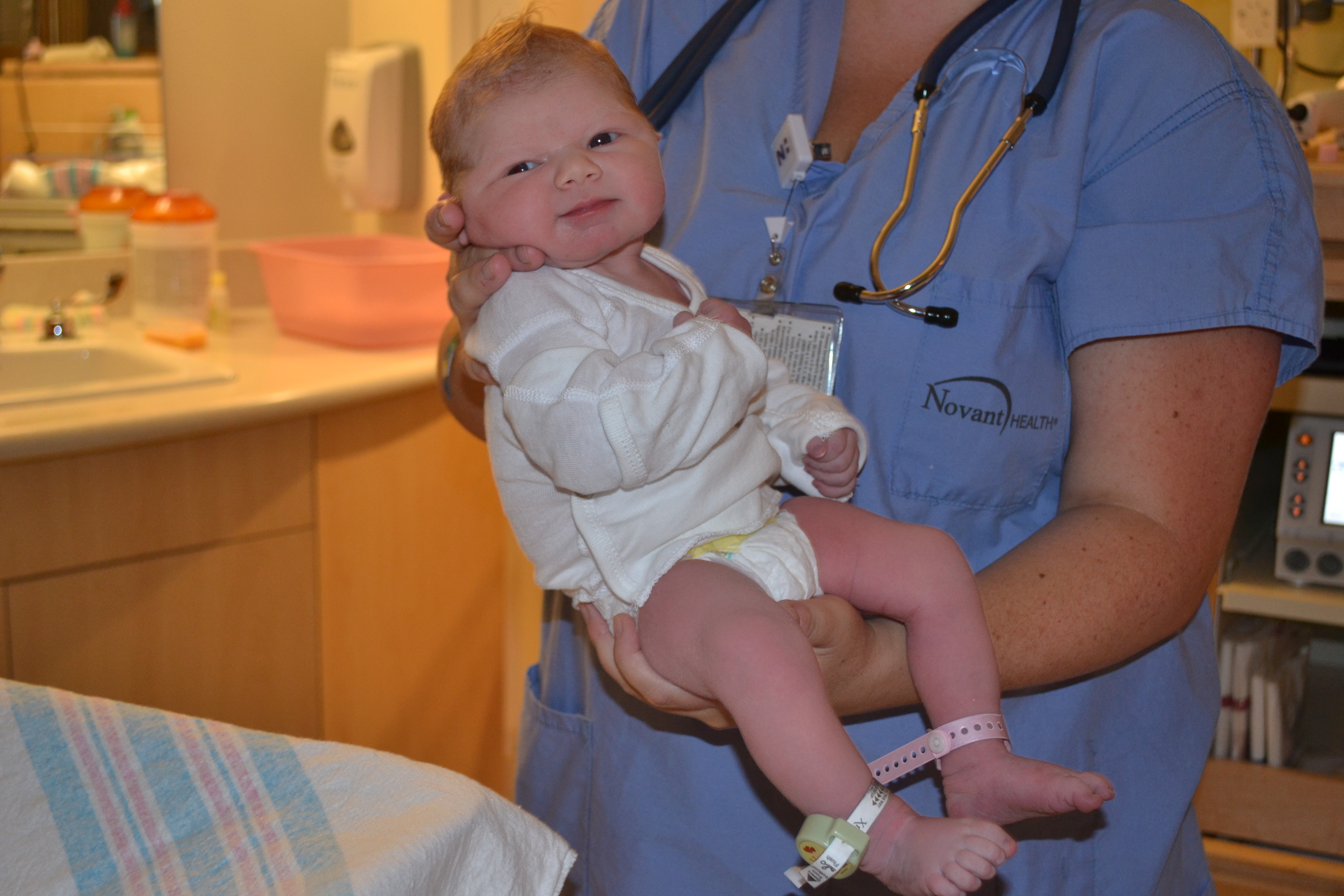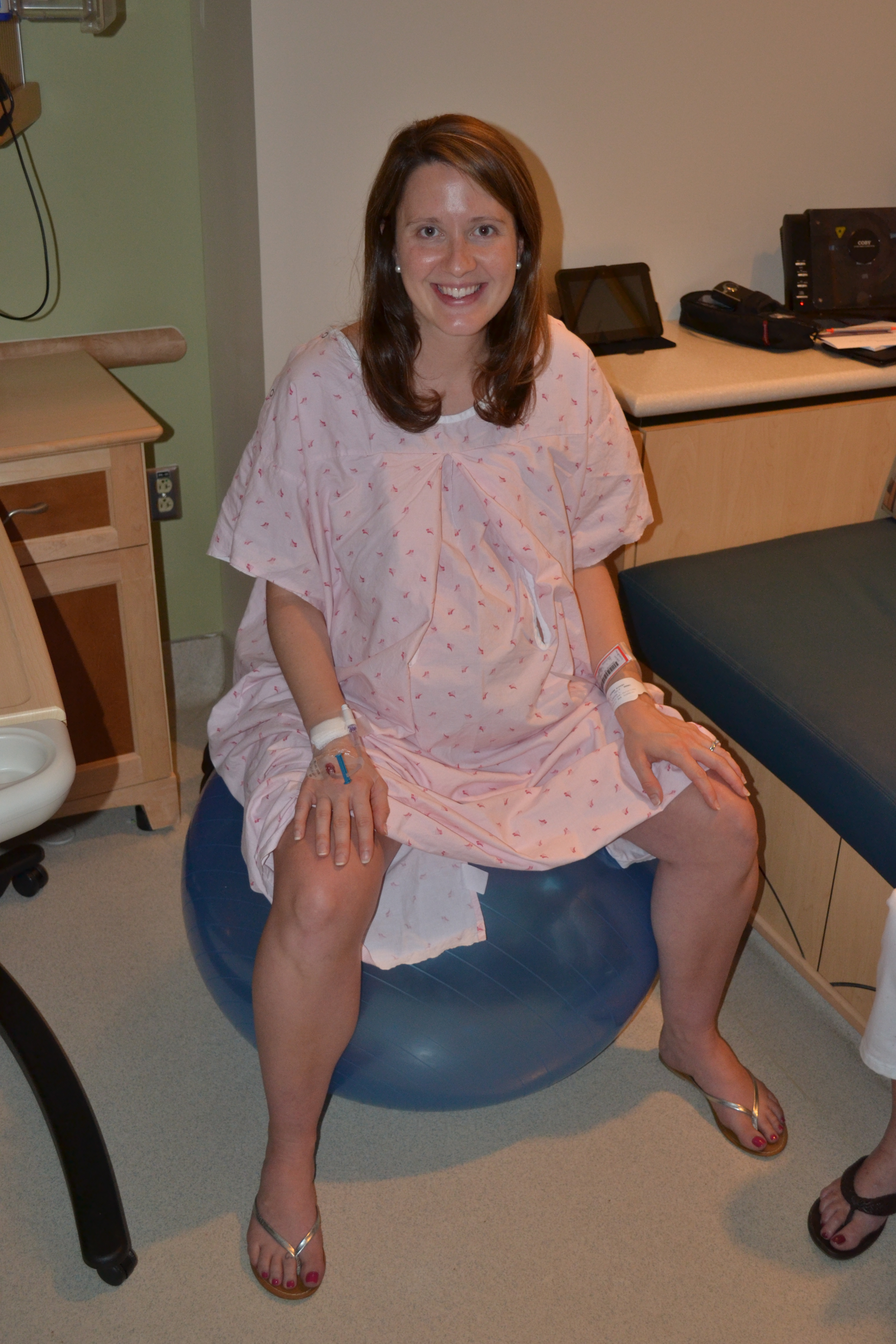 At that point we were approaching shift change, and we were introduced to Tisha (the GREATEST L&D nurse!) and told that Dr. Gorsuch would be delivering us. My contractions lasted through the morning at a manageable rate. Adam and I walked the halls for hours and I spent a while rocking on the exercise ball in our room. Every two hours they’d get me back in the bed to check our heart rates (mine and baby’s, not Adam’s!), but otherwise it was nice to have a little freedom to labor gradually.