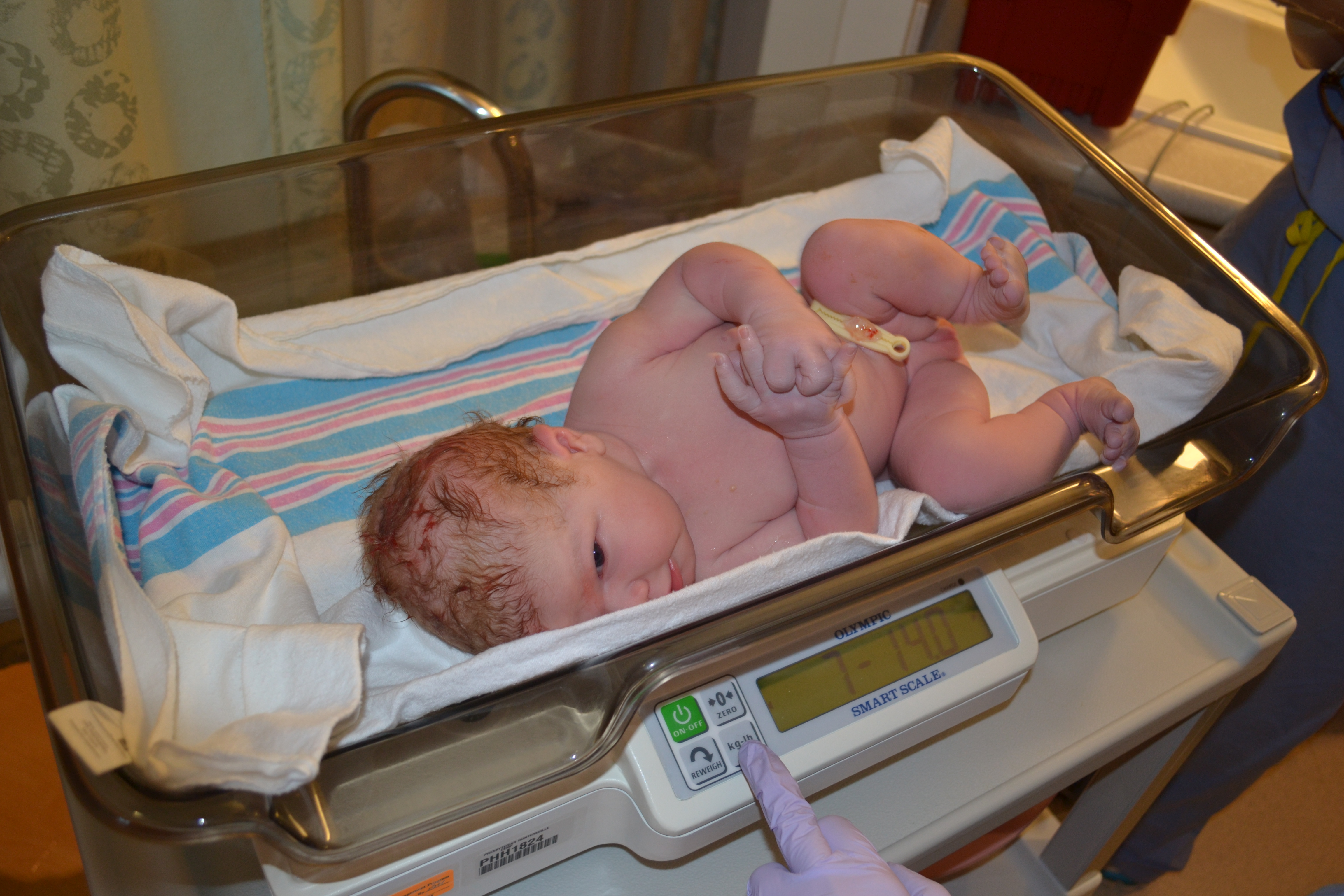 By 2 p.m. I was flat out exhausted, and although the nurses told me they thought I could make it through without an epidural, I decided to order one. I simply didn’t have the energy I felt I’d need to push — and my biggest fear was that I’d end up with an unplanned C-section. Unfortunately it took nearly a full hour for the anesthesiologist to arrive (the hospital was hoppin’, they told me), and I felt every single one of those 60 minutes. The good news was that my body was responding to the contractions…and by the time I got the epidural, I was measuring 9 cm.