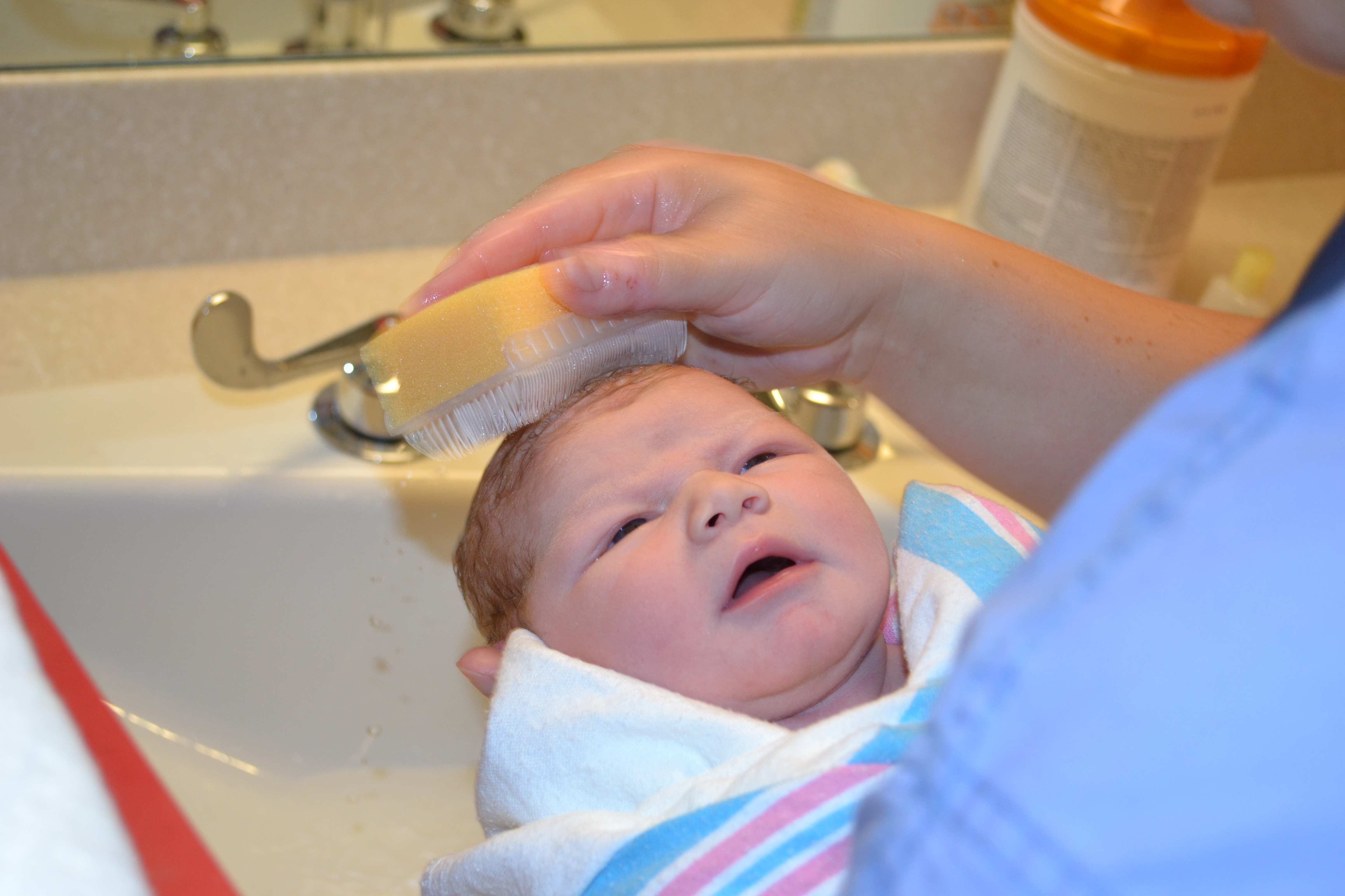 Everyone came to visit in shifts, and Adam got to walk Claire proudly around the room while I made a few calls to share our news with best friends. After a while the nurses gave Claire her first bath (which she loved!), measurements, and footprints as we prepared to move hospital rooms.