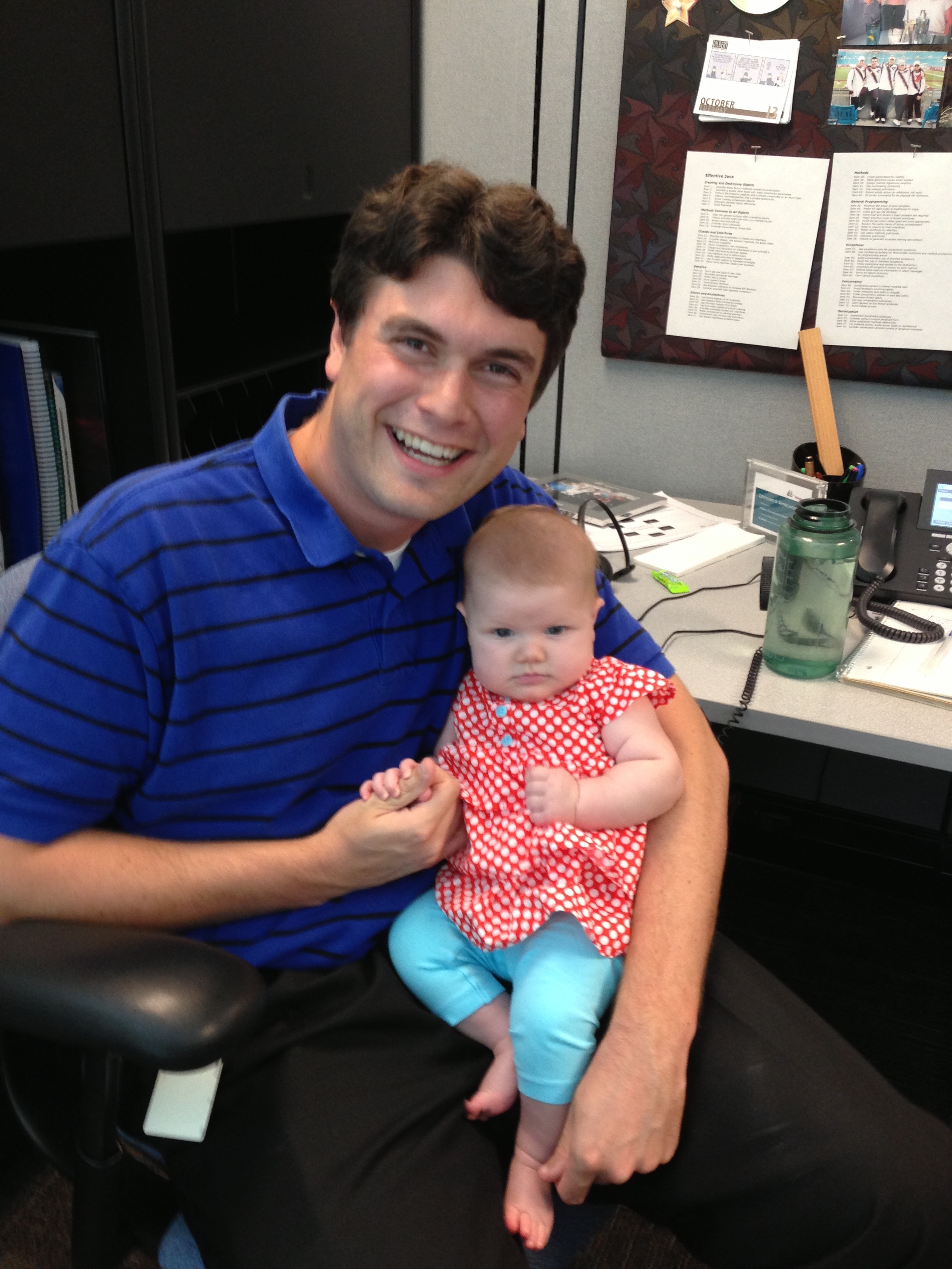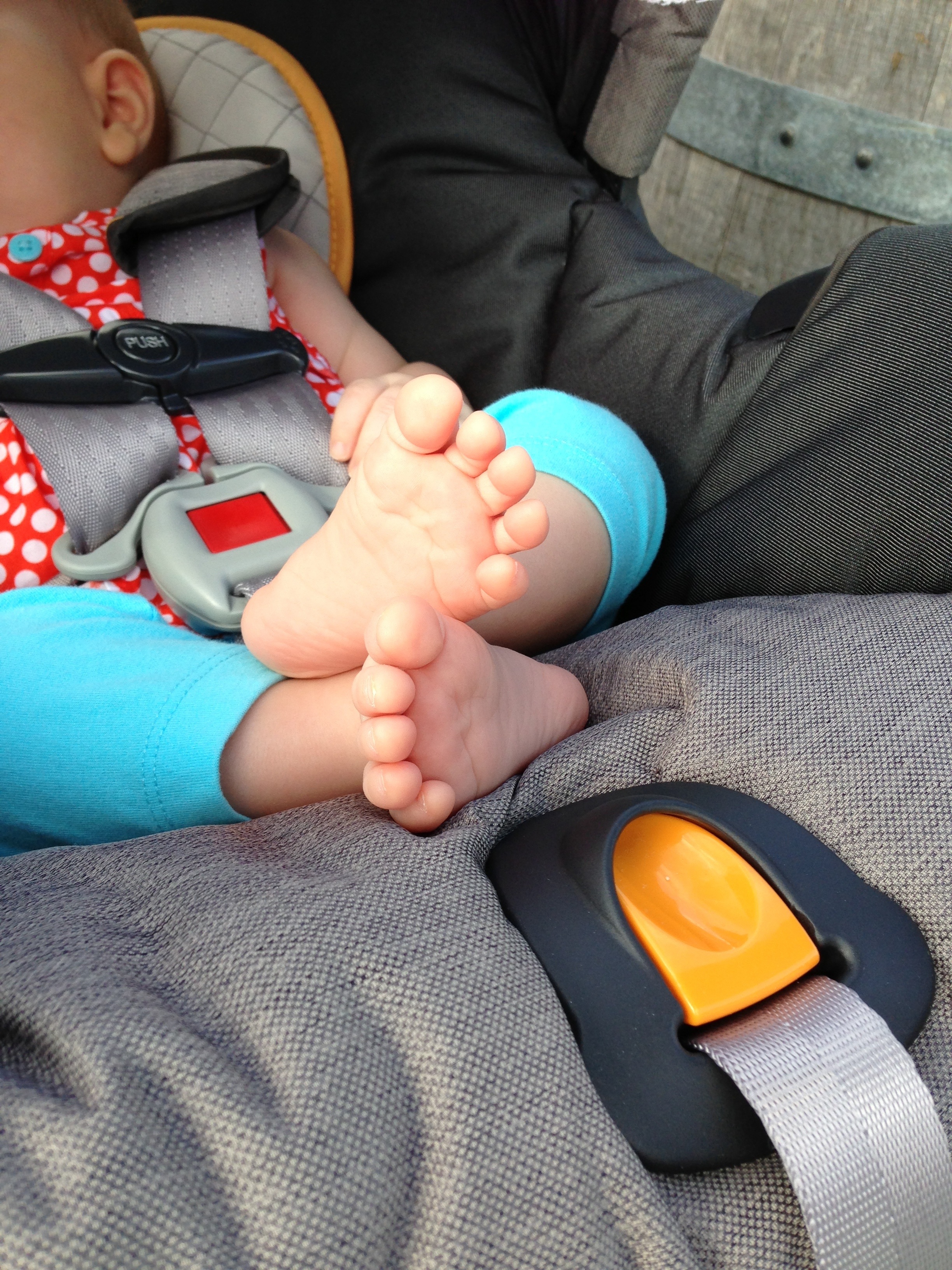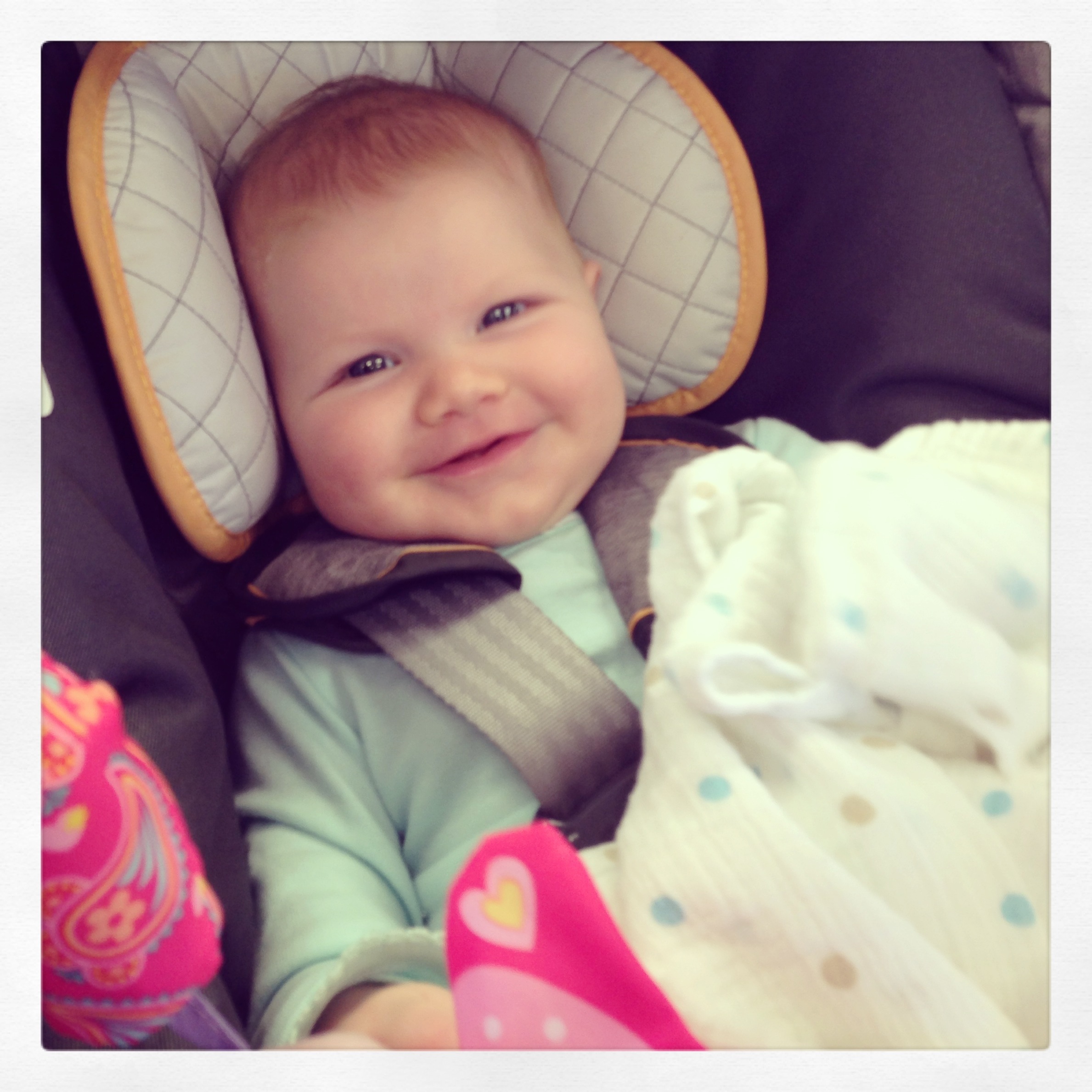 Playing: My goodness you’re a busy girl! When you’re awake, you’re moving — kicking and punching and grabbing and watching. It’s clear you’re already learning so much about this wonderful world, and it’s fun to watch you discover new things. Daddy likes to take you on “Pinot Safaris” to find your pretty kitty, but your favorite game is Airplane, and you’ll let him fly you through the house for as long as his biceps can stand it! Mommy’s favorite thing these days is Babygarten, a fabulous free class for babies 0-18 months taught at the nearby United Methodist church on Monday mornings. There we sing songs, read books, and even make a take-home craft. You’re the youngest baby in the class, but you’ve become Teacher’s Pet and we aren’t one bit surprised.