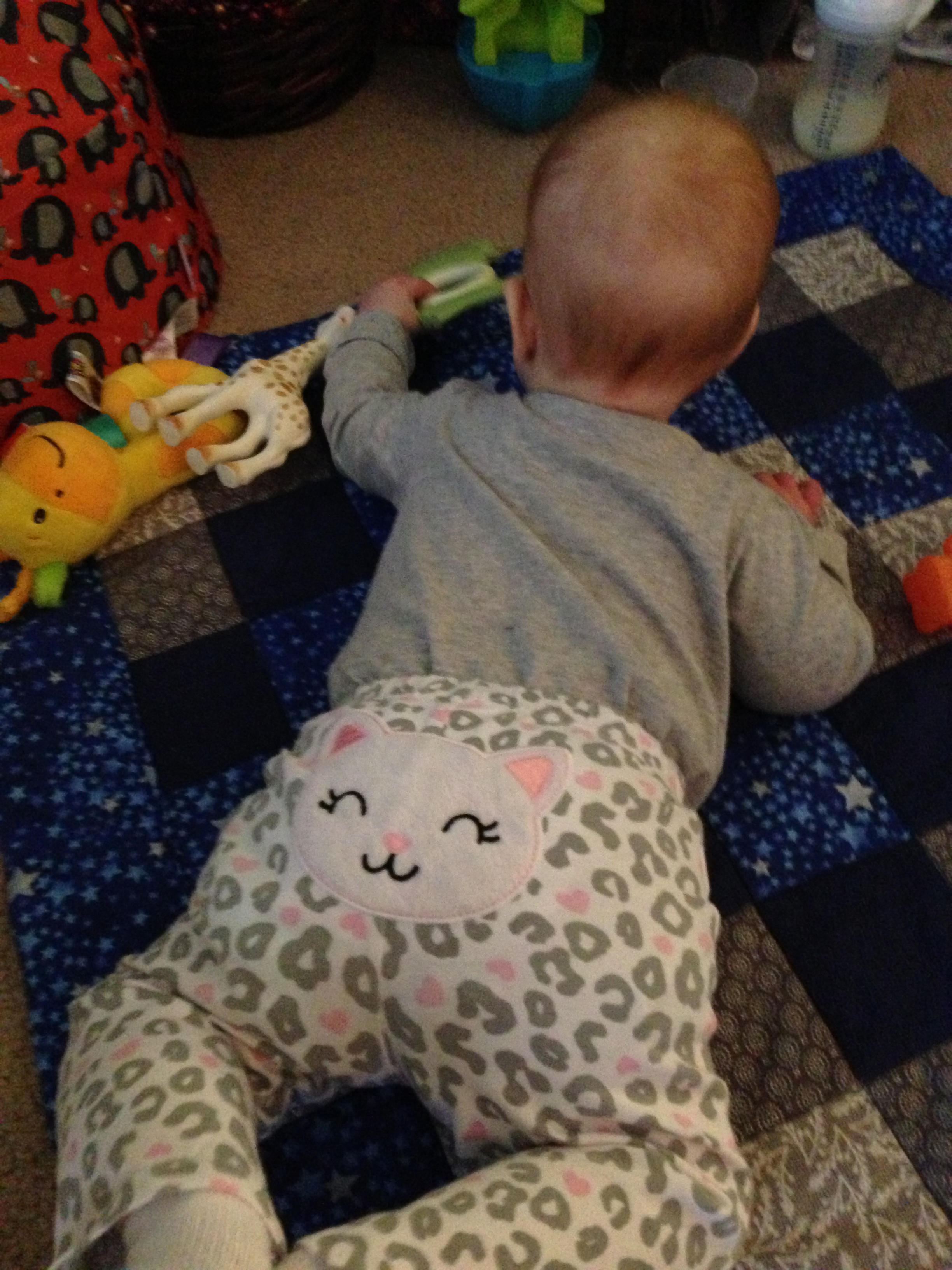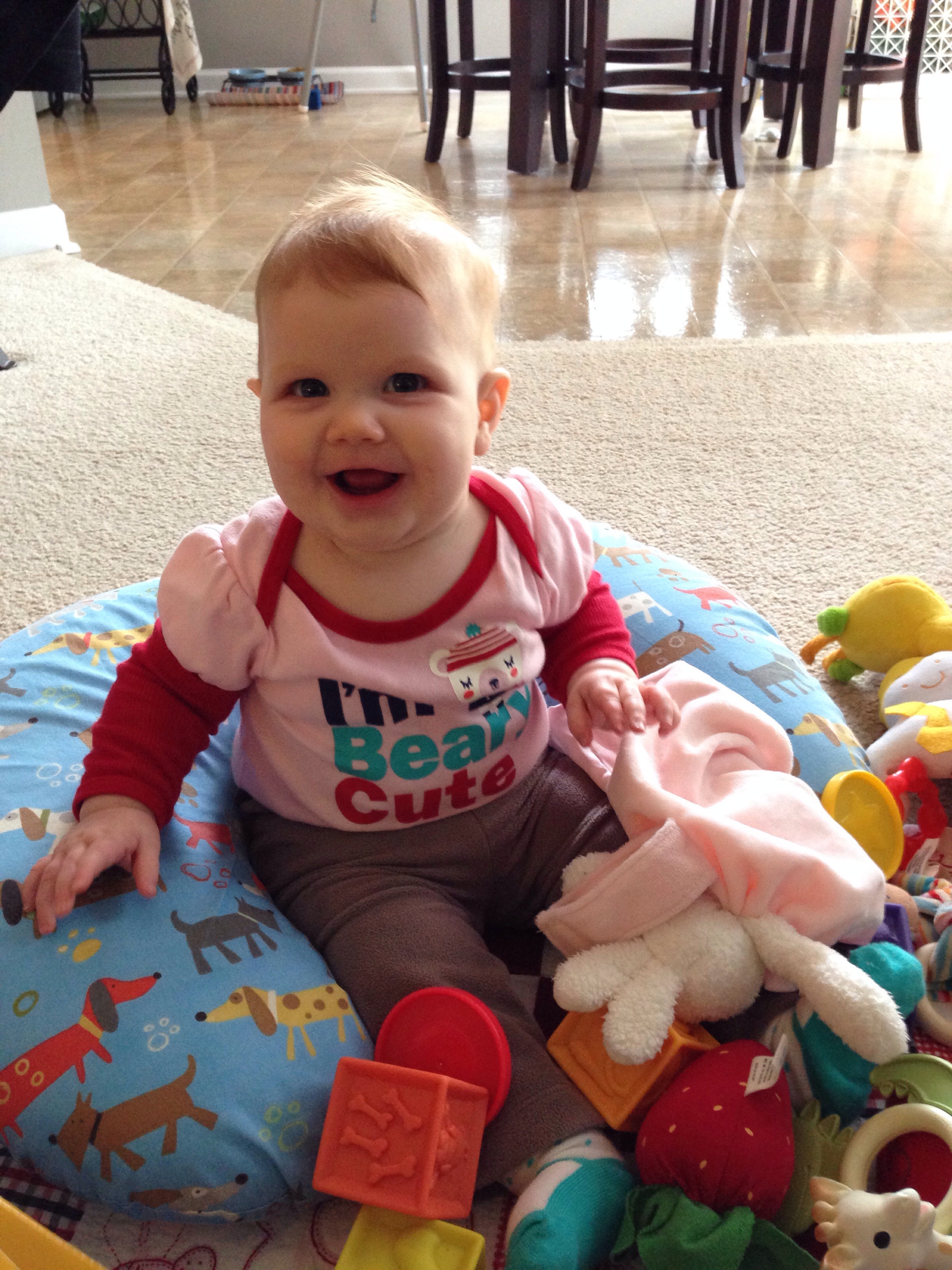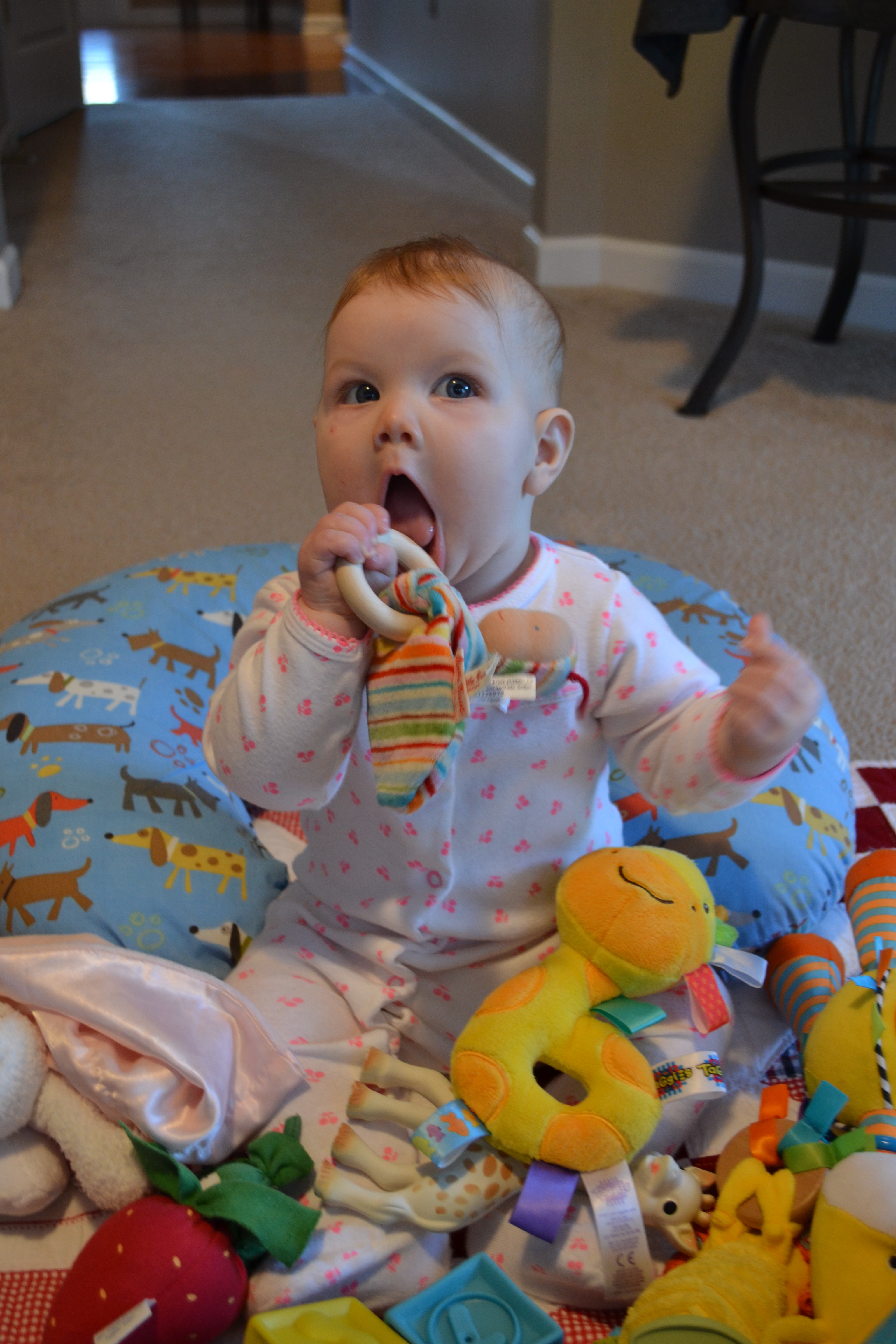 In the last week or so, you’ve also learned to sit (pretty much) unassisted. We like to put a pillow behind you in case you get excited about a toy and lose your balance…but you’ve been spending up to an hour at a time sitting on a quilt playing with toys. My goodness, you’re a curious girl. (And we absolutely love that about you!) You take the time to inspect each toy, tasting it, shaking it, and then throwing it down and searching for another.