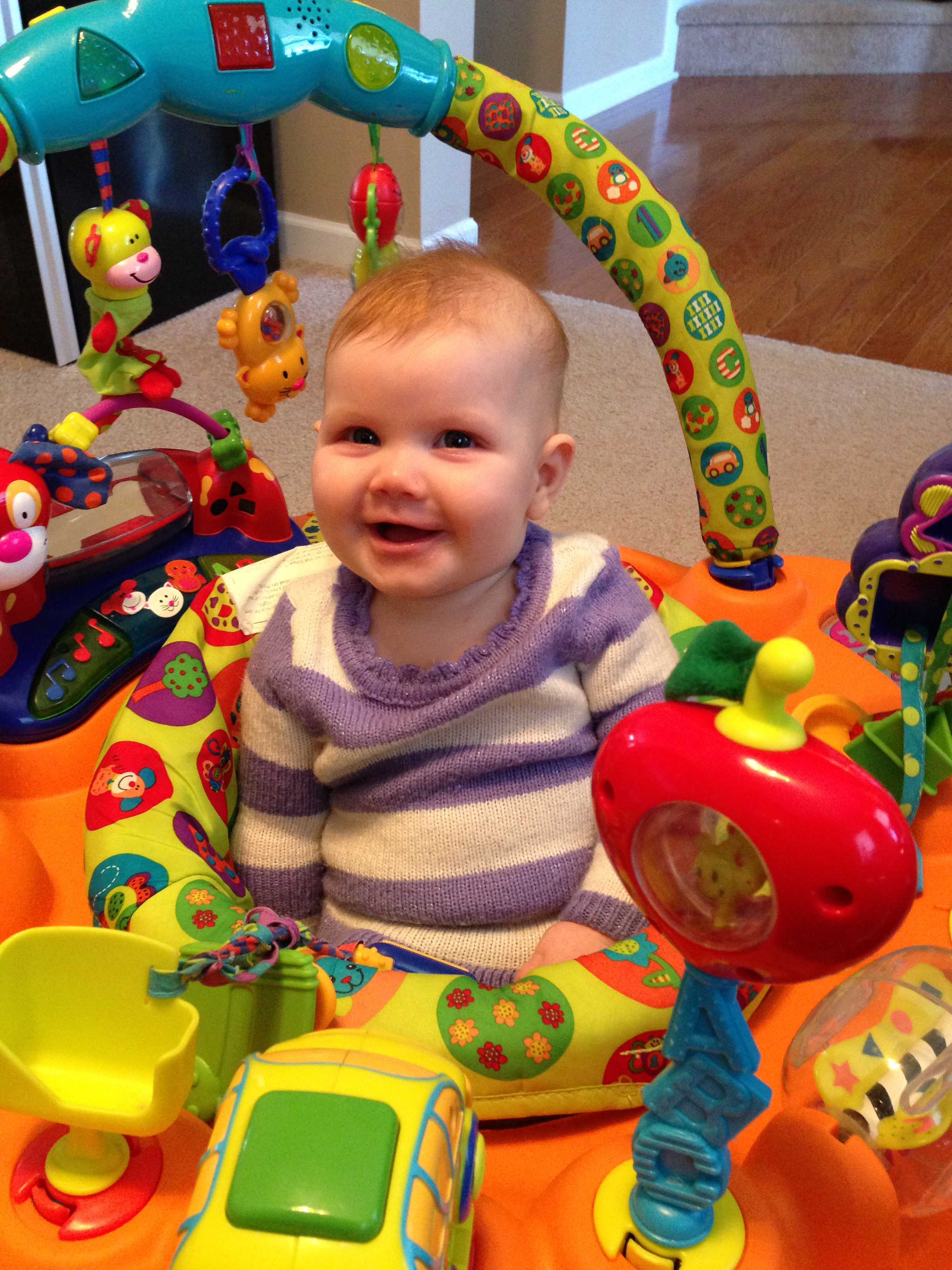 The Exersaucer and Johnny Jump-up are still hits, but you’re also becoming fascinated by stacked blocks (especially knocking them over). Your feet trump them all though, and toes-in-mouth is still your favorite!